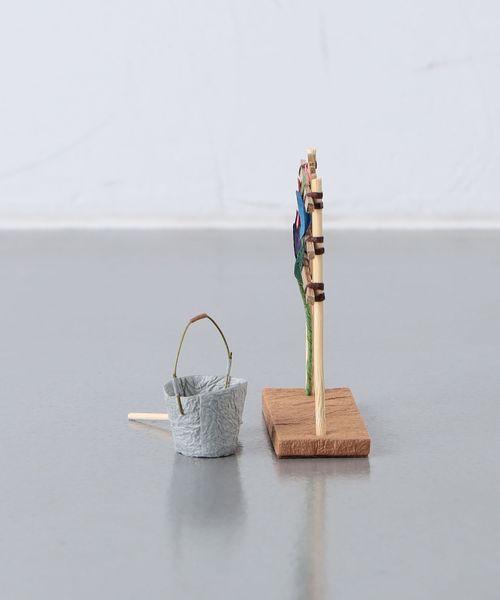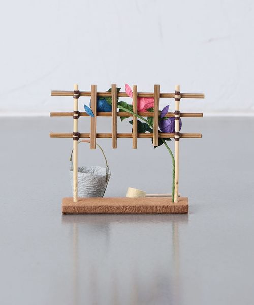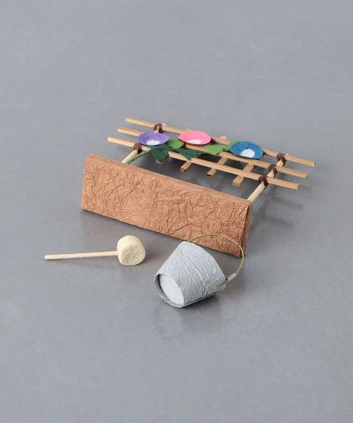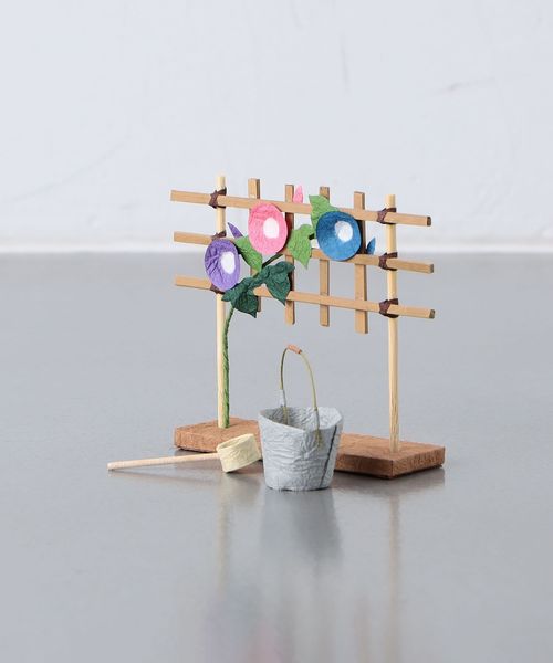 垣根に蔓を伸ばして咲く朝顔、水やり用のバケツとひしゃくをセットにしています。