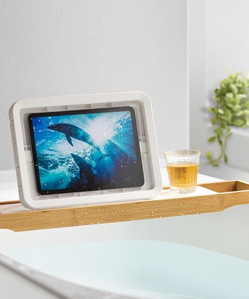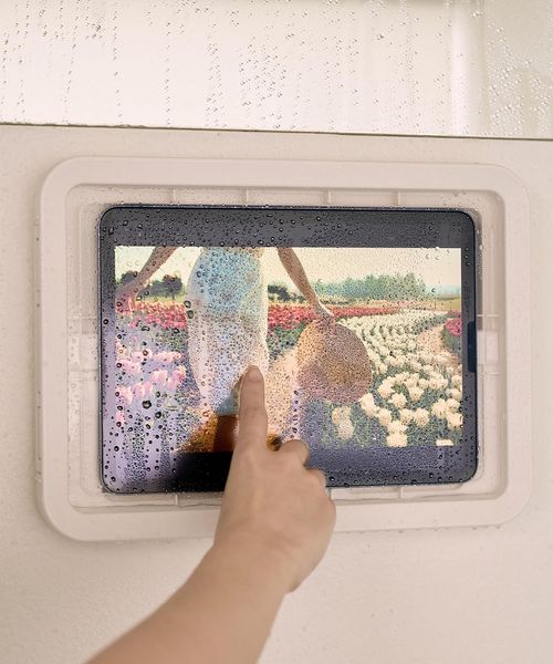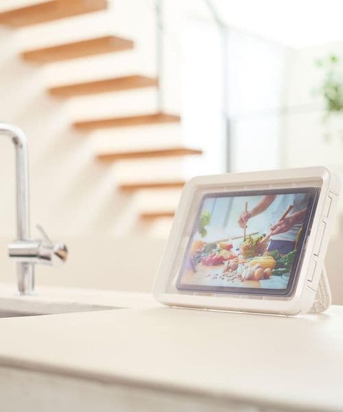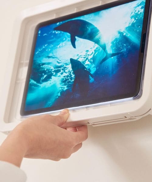 おふろやキッチンなど水回りでも、映画や音楽などをタブレットで満喫できるマグネット・スタンド付きのタブレット専用防水ケースです。