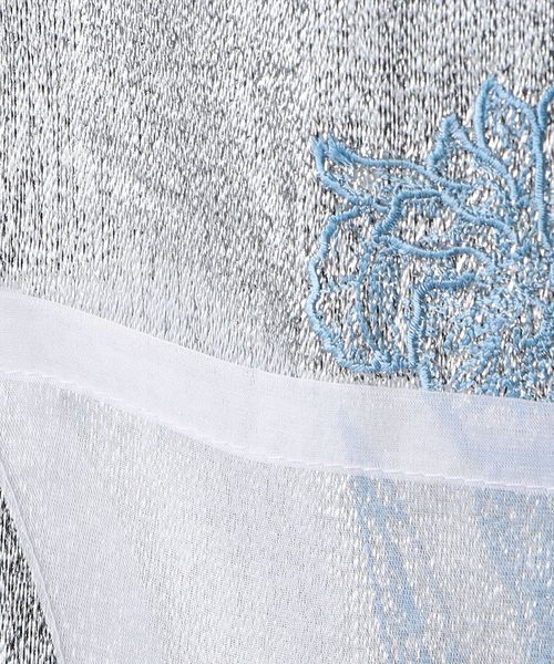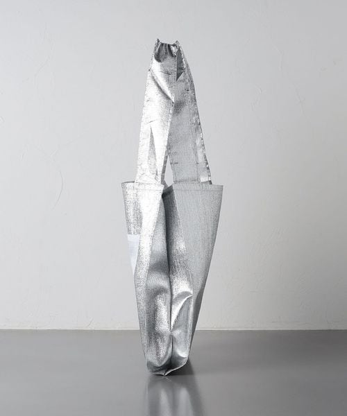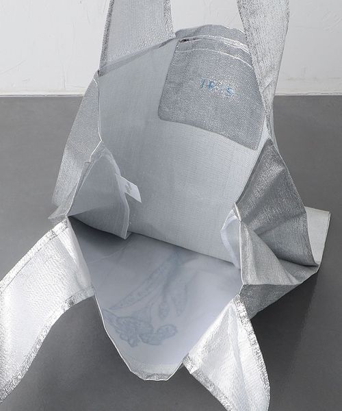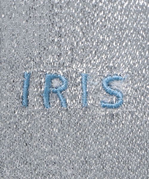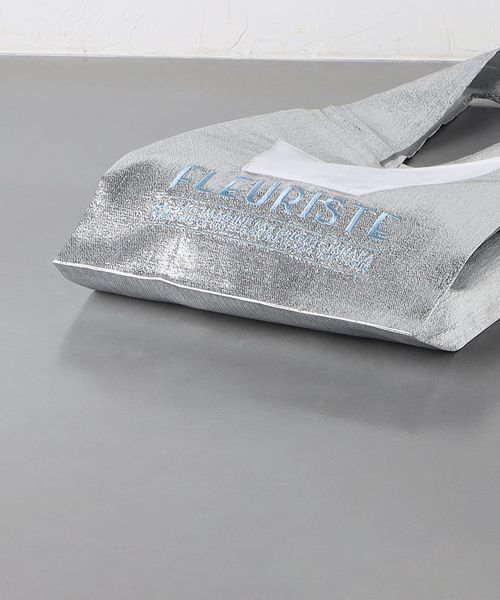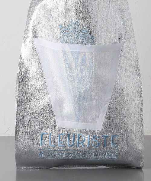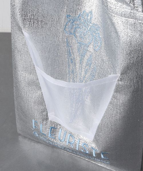 メタリックシルバーの生地にアイリスの花を刺繍した、布製フローリストバッグ。