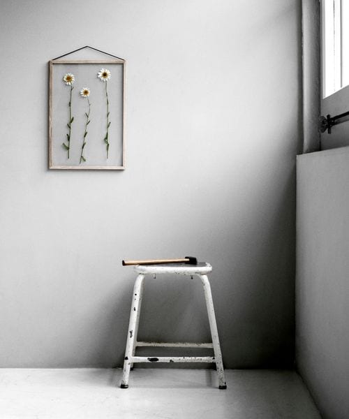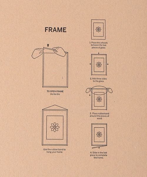 2枚のアクリル板に写真や絵、ポストカード、植物、テキスタイルなどを挟み、4本のフレームをラバーバンドで固定するというシンプルなつくり。