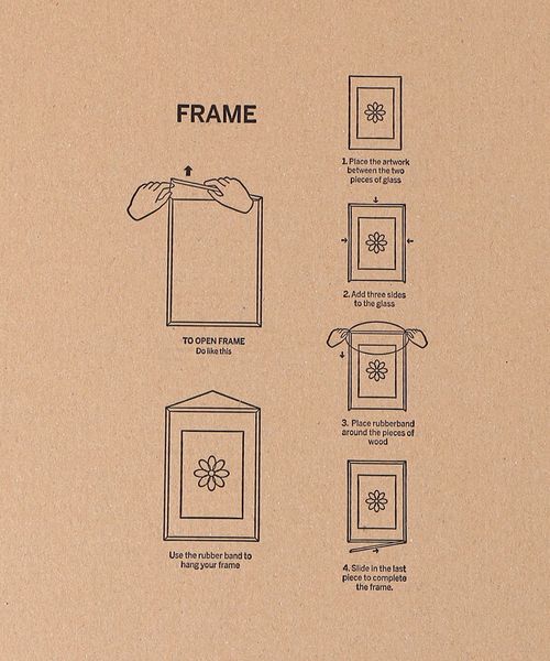 2枚のアクリル板に写真や絵、ポストカード、植物、テキスタイルなどを挟み、4本のフレームをラバーバンドで固定するというシンプルなつくり。