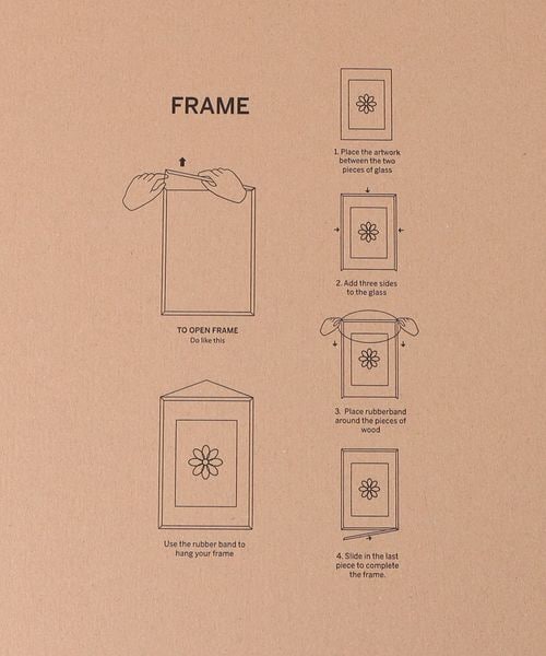 2枚のアクリル板に写真や絵、ポストカード、植物、テキスタイルなどを挟み、4本のフレームをラバーバンドで固定するというシンプルなつくり。