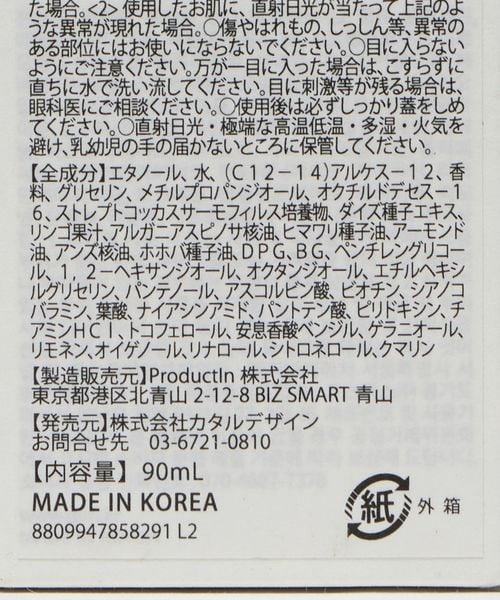 1. 化粧品使用時または使用後直射日光により使用部位が赤い斑点、腫れやかゆみなどの異常症状や副作用がある場合は専門医等と相談すること