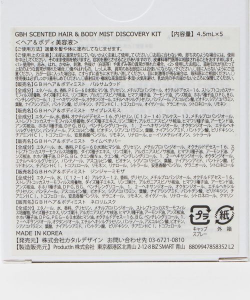 毛髪や肌にうるおいを与えるヘア&ボディミストの5つの香りをセットにしたディスカバリーキット。