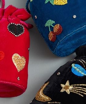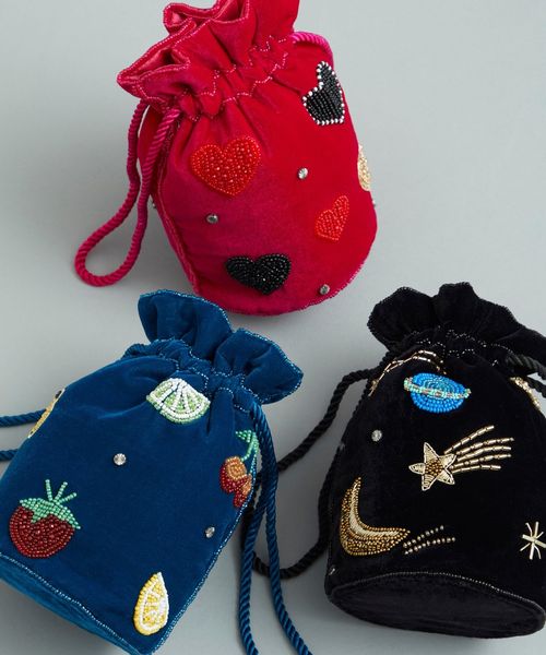 ベロア素材に様々なモチーフを繊細なビーズの手刺繍で表現したドローストリングポーチ。