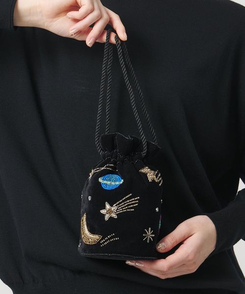 ベロア素材に様々なモチーフを繊細なビーズの手刺繍で表現したドローストリングポーチ。