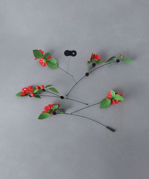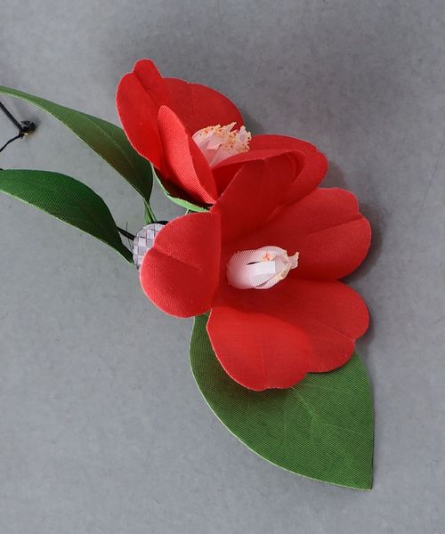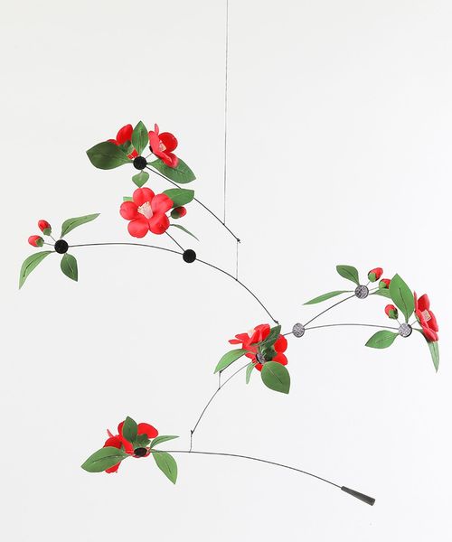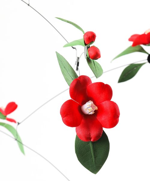 ひな人形に彩りを添える造花技術を使ってつくられた鮮やかな椿のモビール。