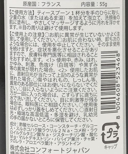 ティースプーン1杯分を手のひらに取り、少量の水(またはぬるま湯)を加えて泡立て、洗顔後の肌に塗布し、やさしくマッサージするように汚れを浮かせます。