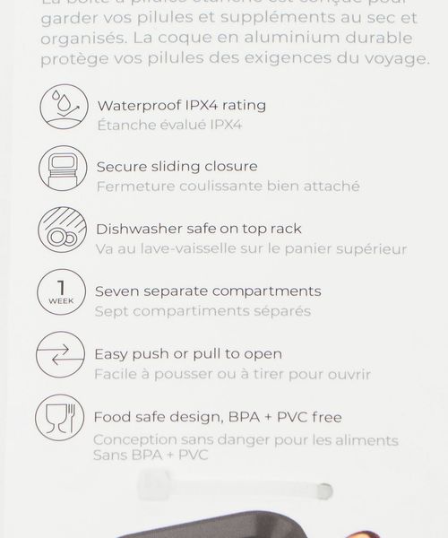 スライド式の設計で7つのコンパートメントがあり、日ごとまたは種類別に整理できます。