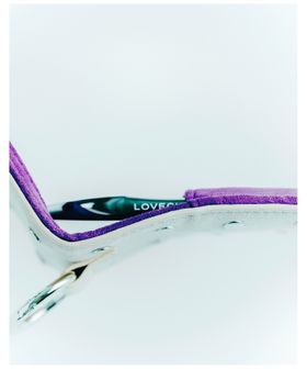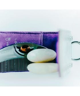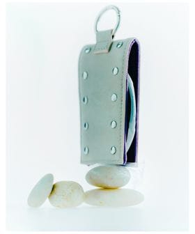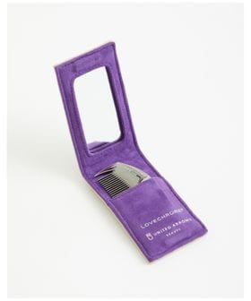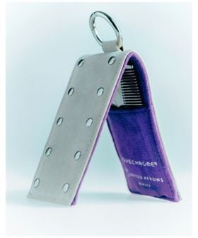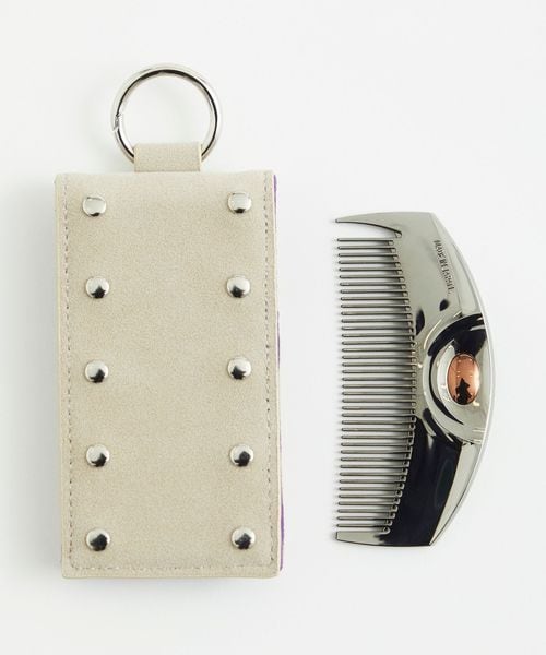 <LOVECHROME>のインラインモデルに合わせた専用ケースは、スエードライクな生地にスタッズを施し、自由なカラーリングとエッジーなムードを表現。ベージュ×パープルのバイカラーで、ケース内側にはさりげなくダブルネームを配置しています。ボトムスのベルトループやバッグ、キーホルダー等に付けられるチャームのようなデザインは、コームをより身近に、ファッションとして楽しむことはもちろん、ミラー付きで出し入れしやすく機能性にも優れています。