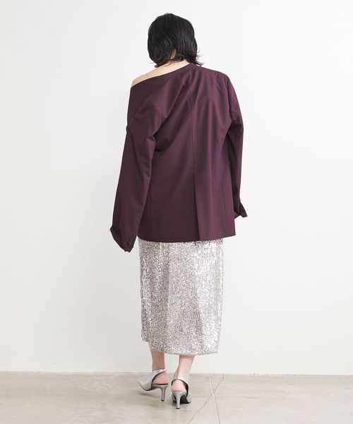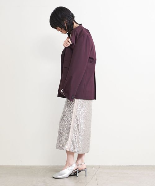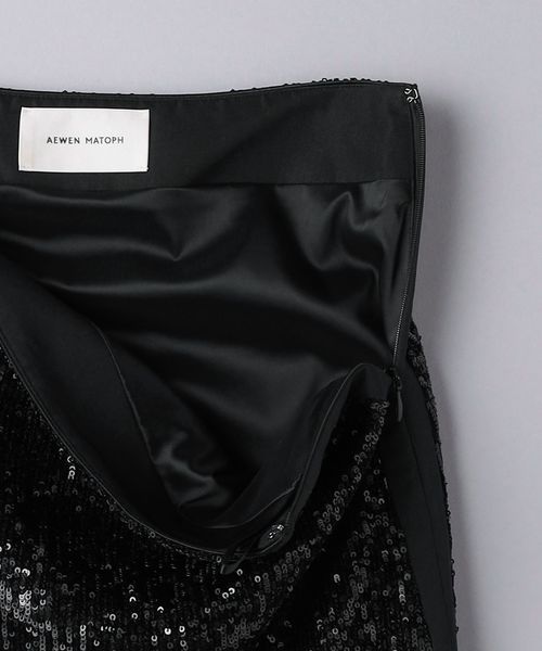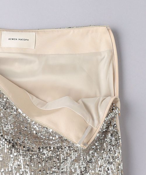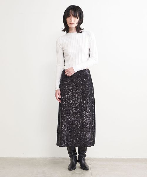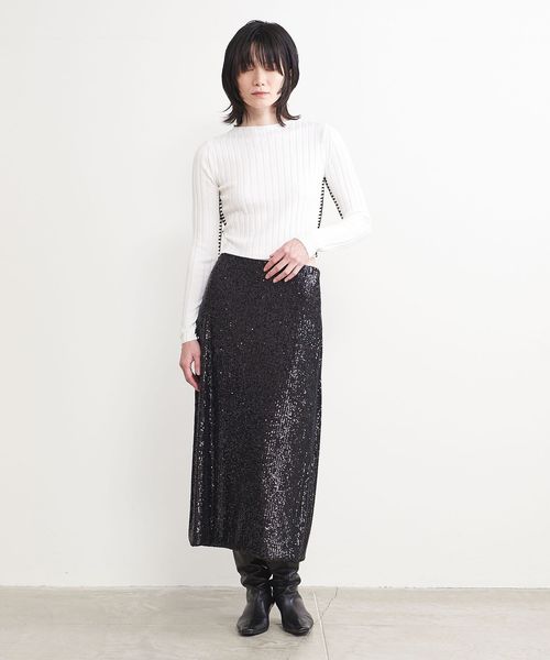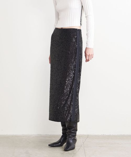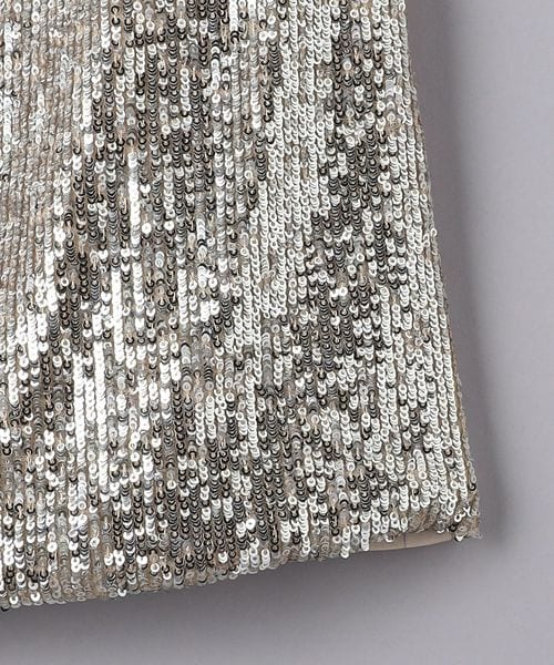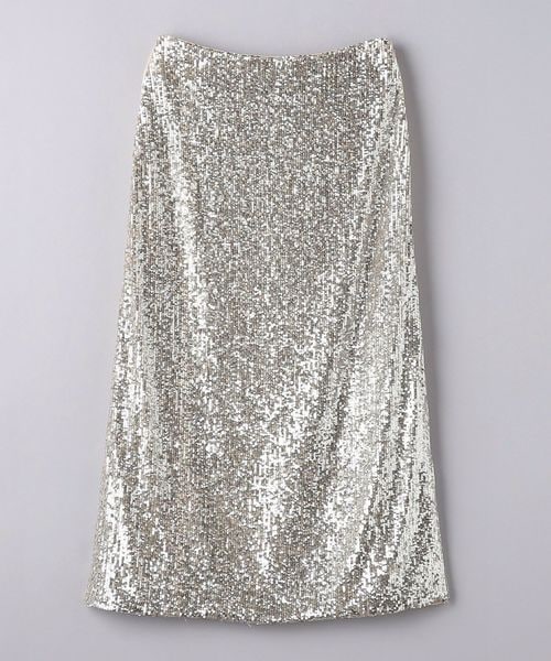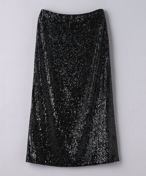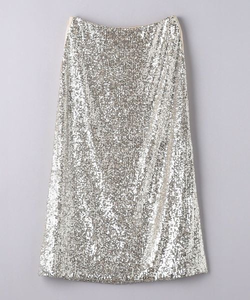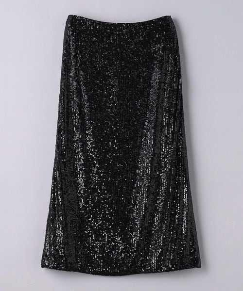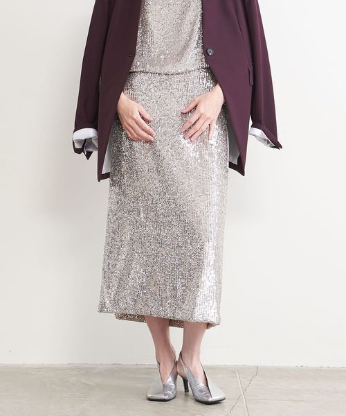 着こなしの主役にぴったりのスパンコールが華やかなタイトスカート。
