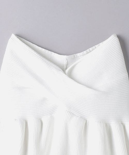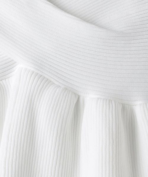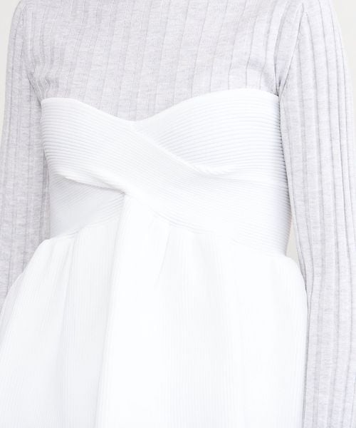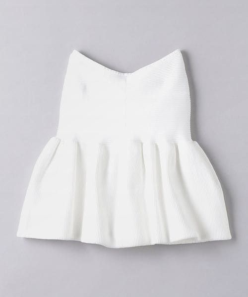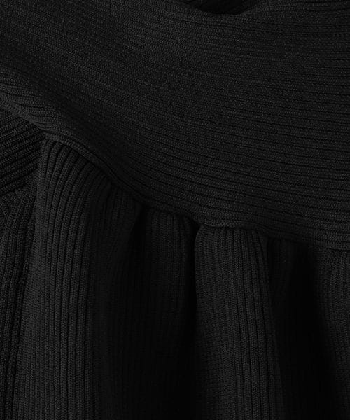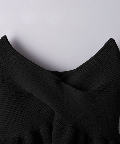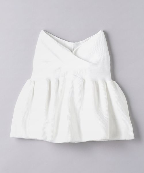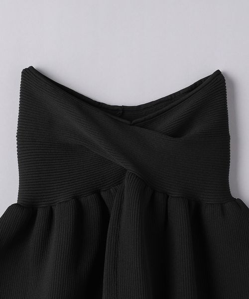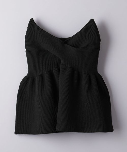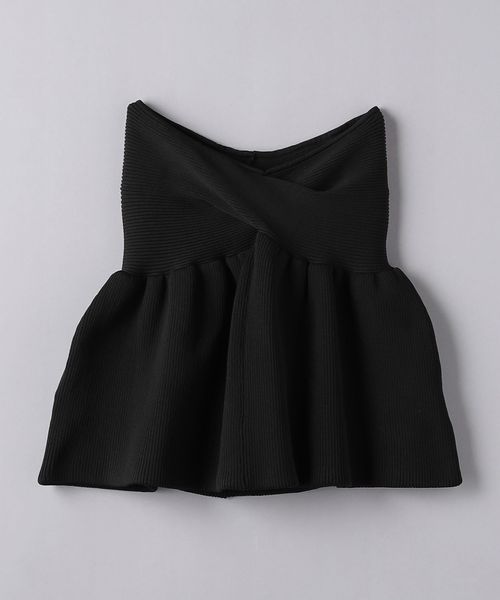 胸部分の大胆なクロスと胸下部分のたっぷりとした分量のギャザー、裾のバルーンがデザインポイントのニットビスチェ。