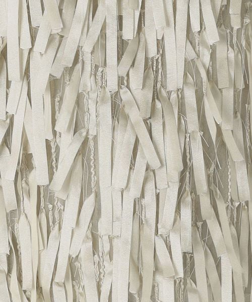 基布のオーガンジーにテープを刺繍し、ランダムなハンドカットでフリンジに。