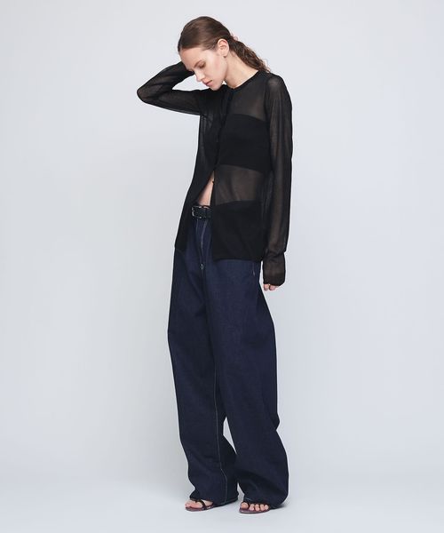すっきりとコンパクトなシルエットには、ワイドパンツあわせでモードなスタイルがおすすめ。