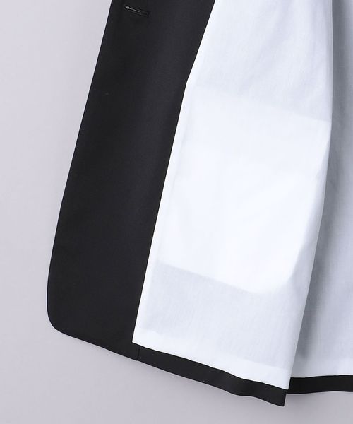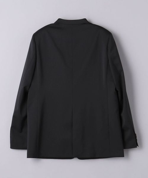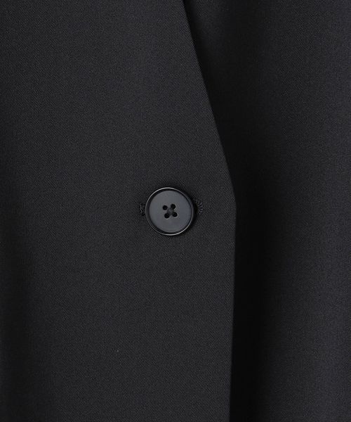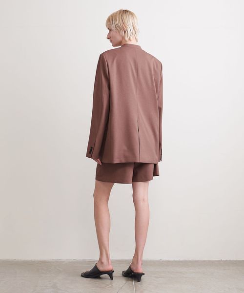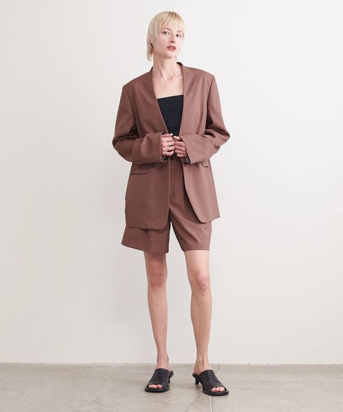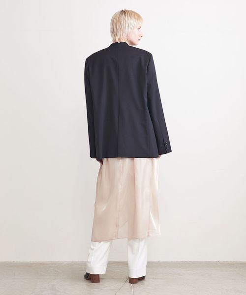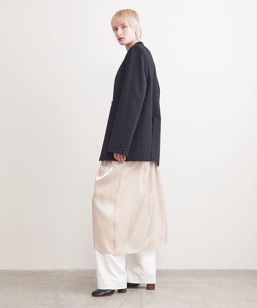 モードな印象のパワーショルダーにゆったりとした身幅のノーカラージャケット。