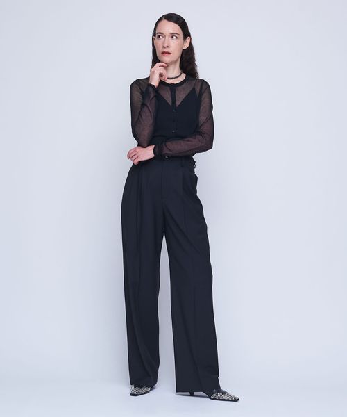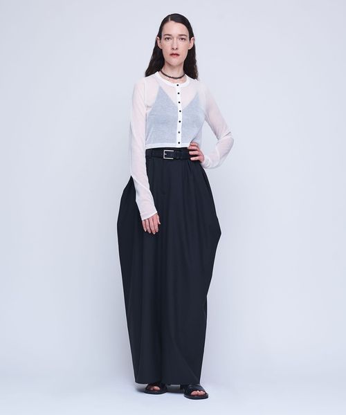 コクーンパンツとのあわせがバランスよく、モードな印象の装いに。
