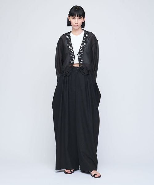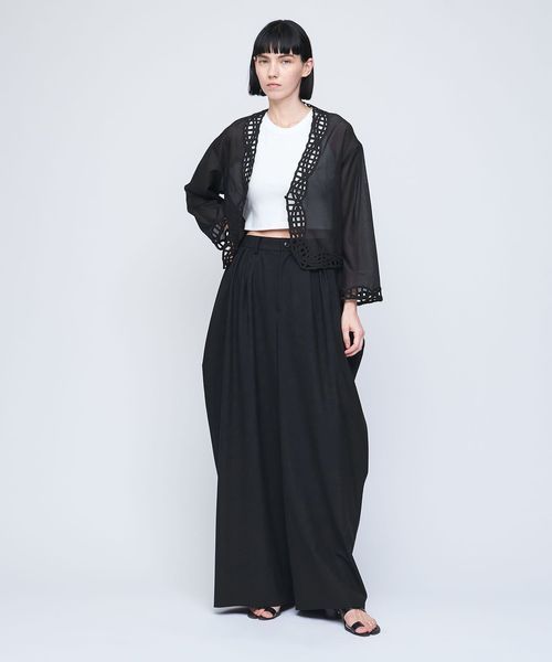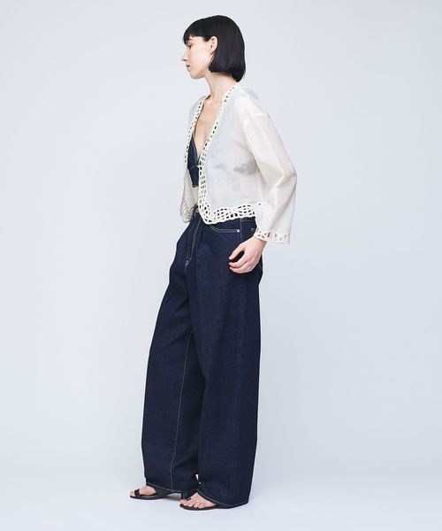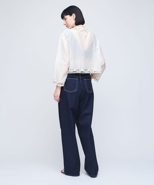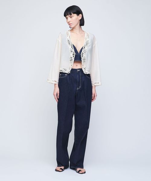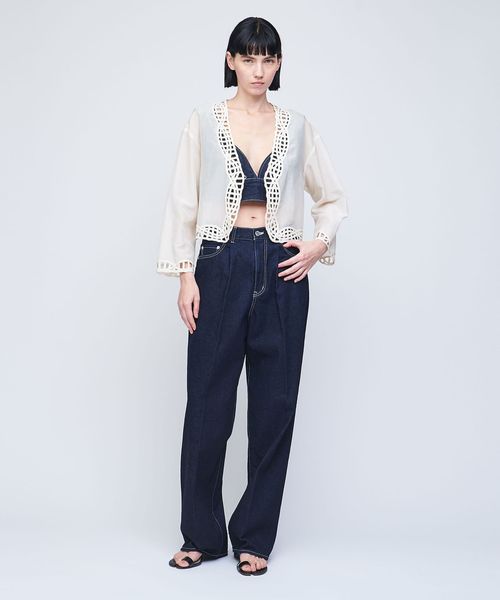 甘めな刺繍ジャケットは、きれいめなデニムやメンズライクなスラックスとのミックススタイリングがおすすめ。