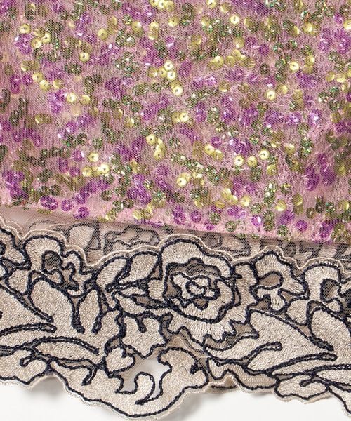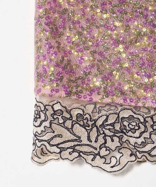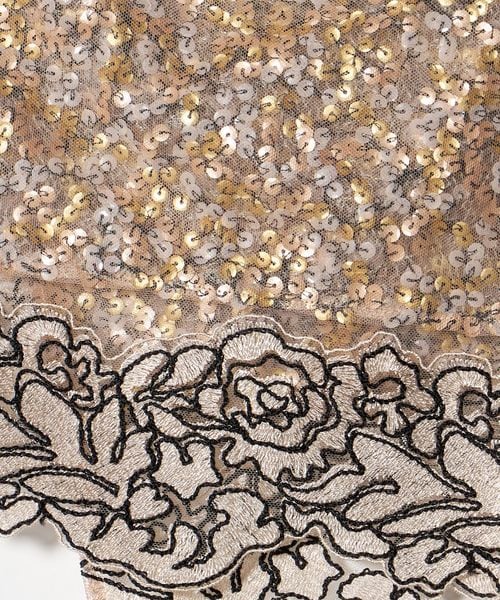 スパンコール素材とチュールを重ね、裾には刺繍テープをあしらった贅沢な一着です。