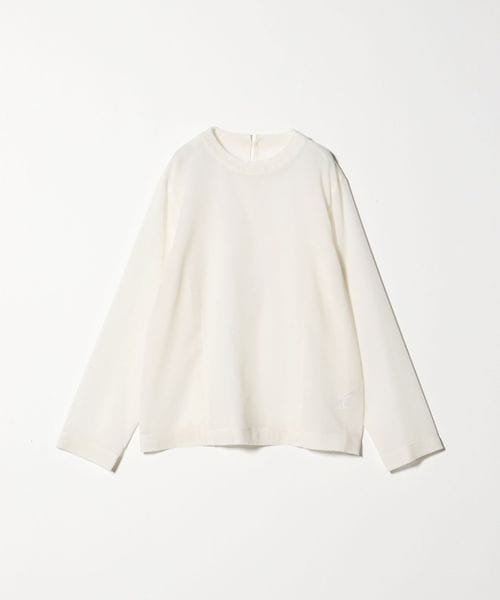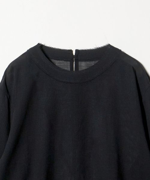 襟周り、袖口、裾をカットオフで仕上げたクルーネックのブラウス。