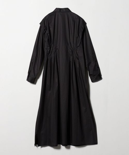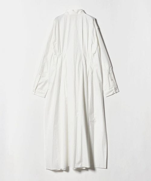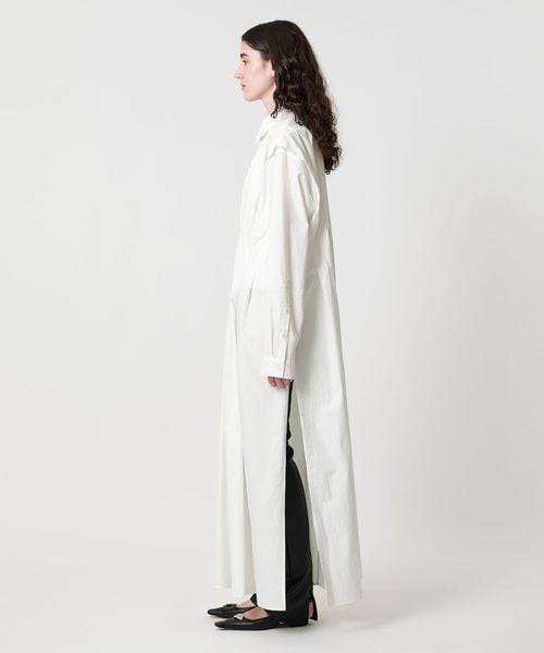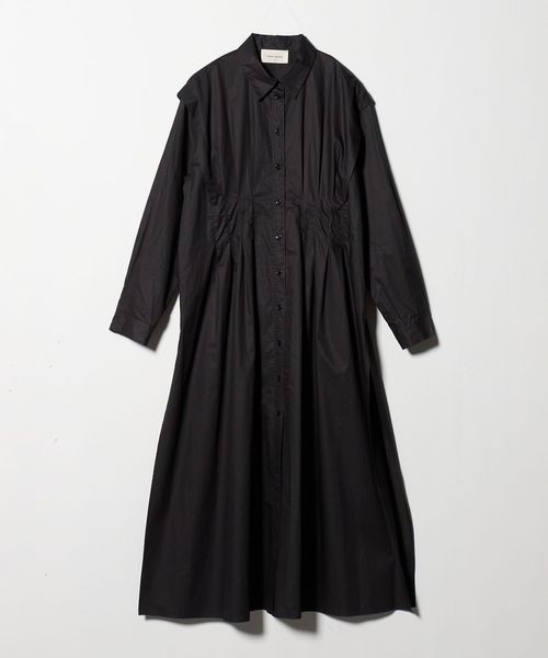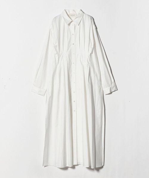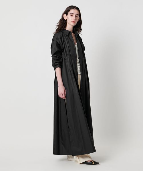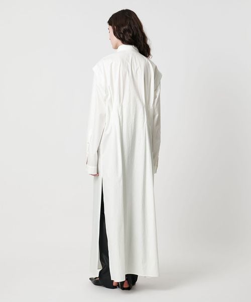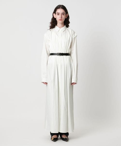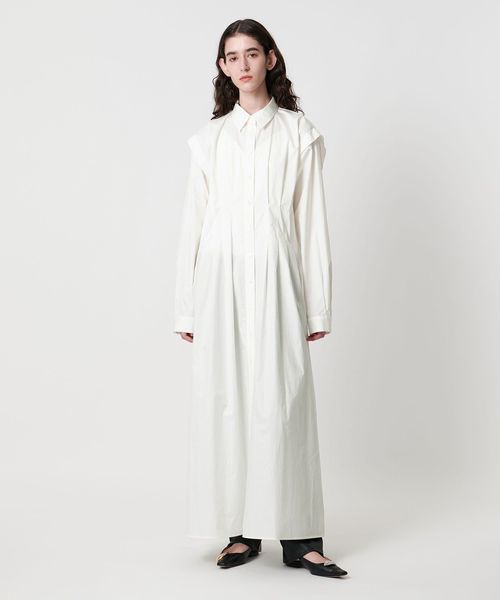ウエストのイレギュラータックと、肩回りのタックがポイントのマキシ丈シャツワンピース。