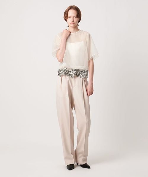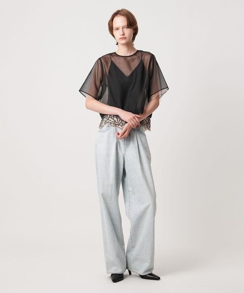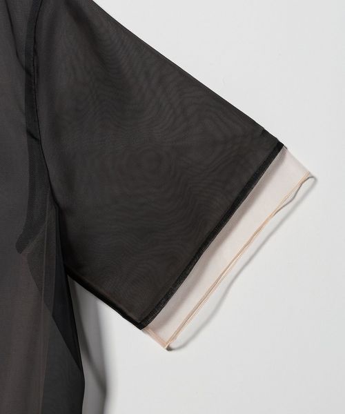 シアー素材のレイヤードが魅力のTシャツ型デザインブラウス。