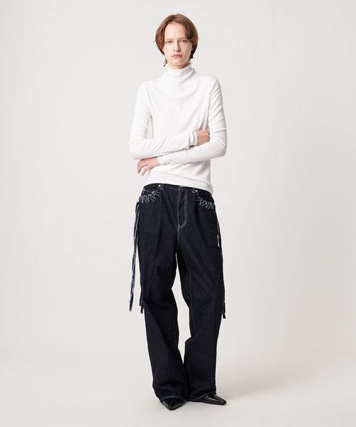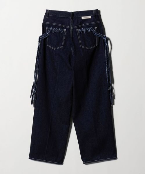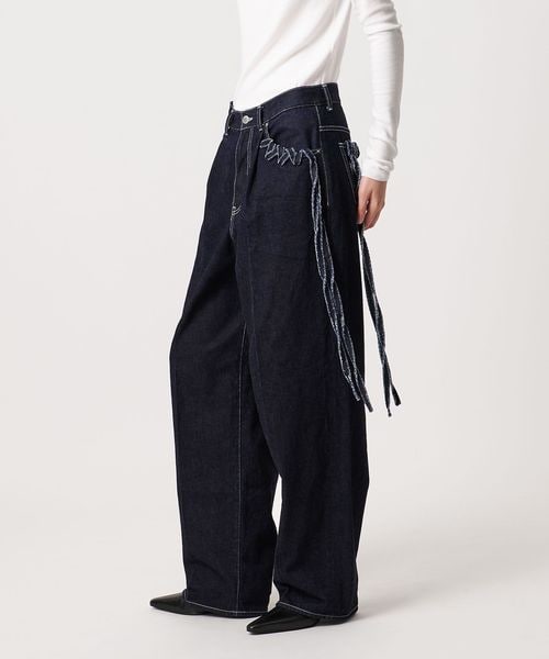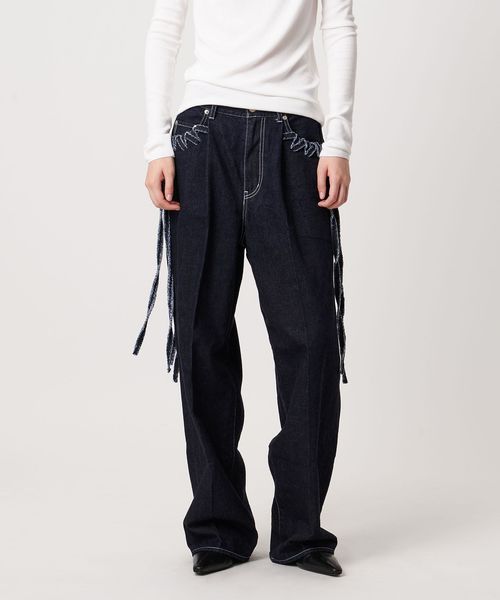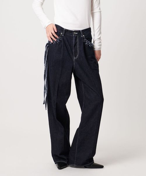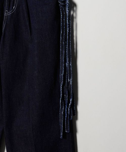 動くたびに揺れる、ボディと同じ素材の紐テープがポイントのデニムパンツ。