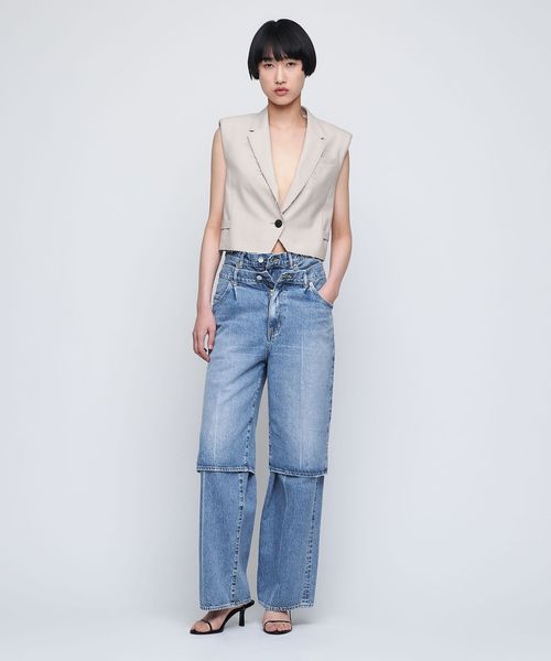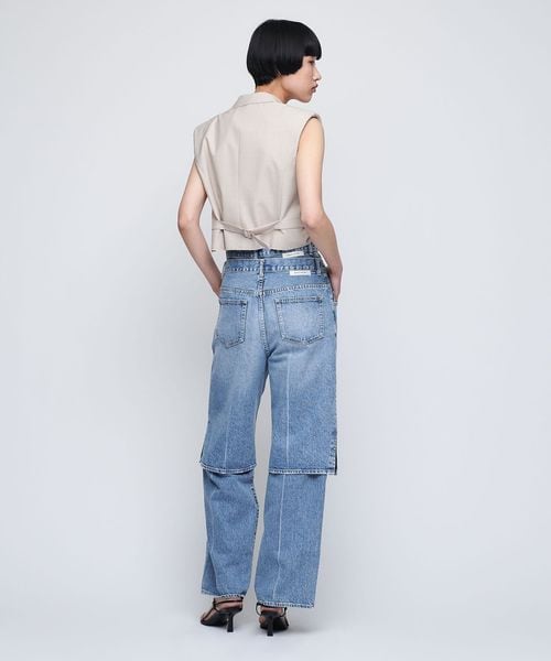 フルレングスのデニムパンツに重ねたスタイルもおすすめ。