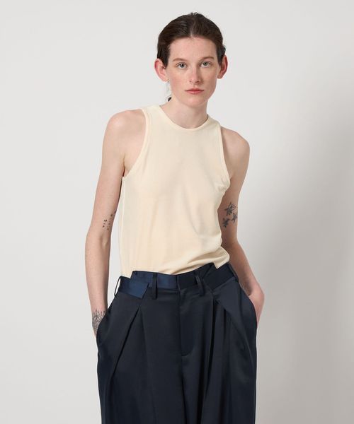 体にフィットする身頃と、ミニマムな襟ぐりがモードな印象。