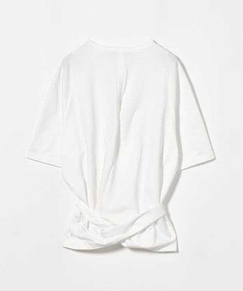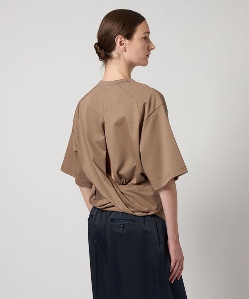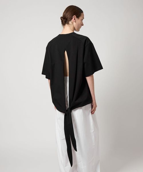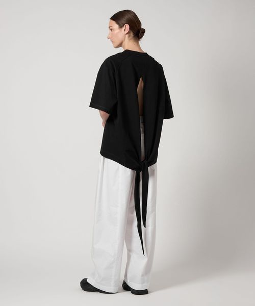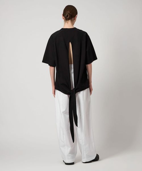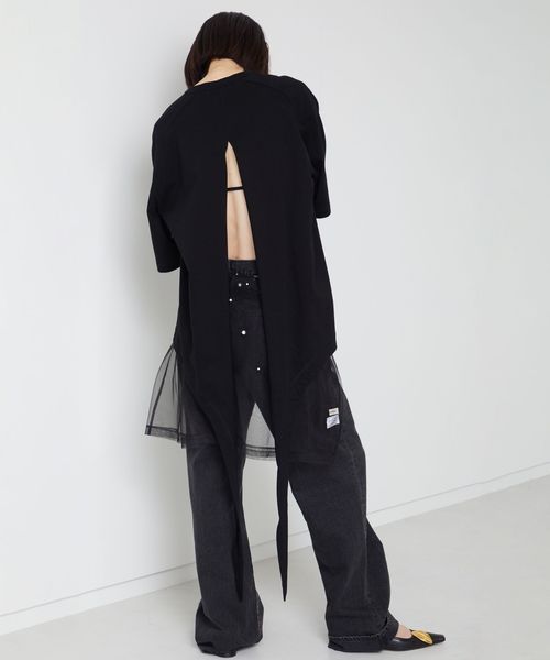 バックスタイルは大胆なスリット開きと、長めのイレギュラーヘムが特徴のTシャツ