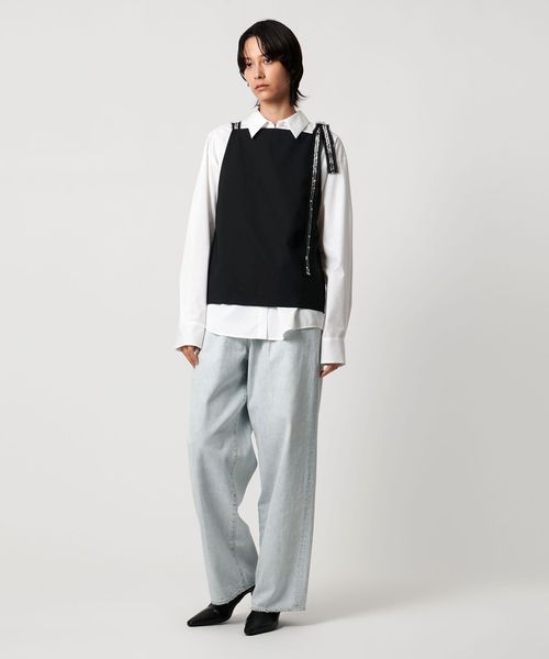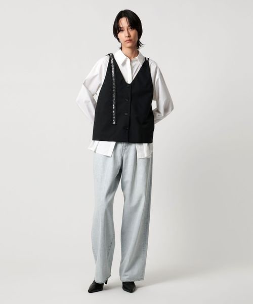 同素材のカーブパンツとのセットアップスタイルは、オールインワン風のコーディネートをお楽しみいただけます。
