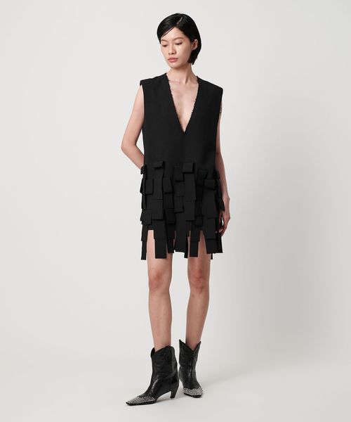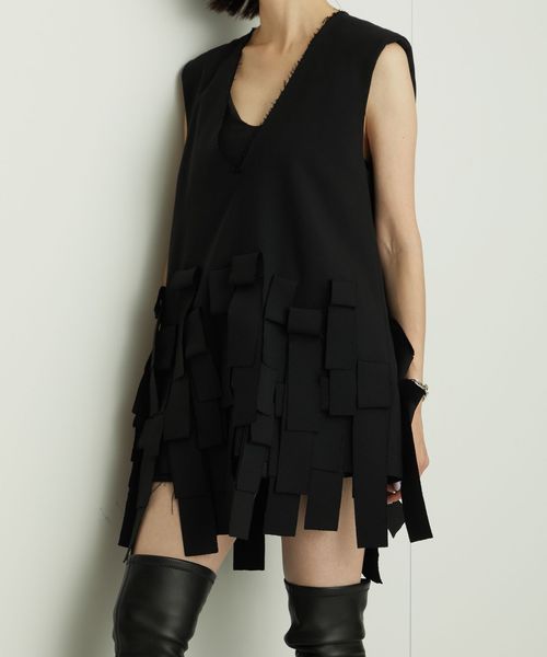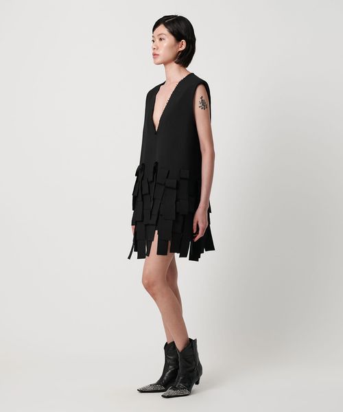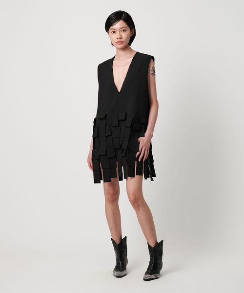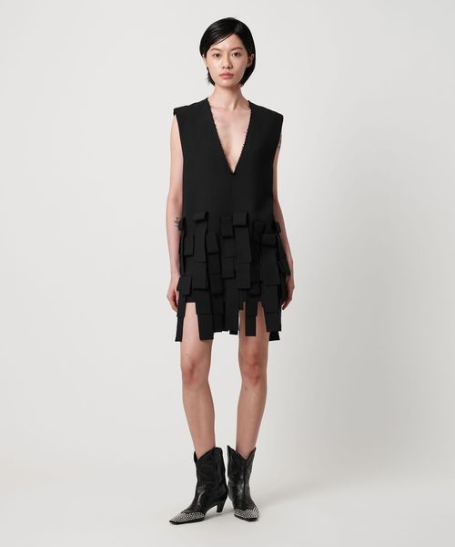 ボリュームたっぷりな共布フリンジが華やかな、ディープVネックのミニワンピース。