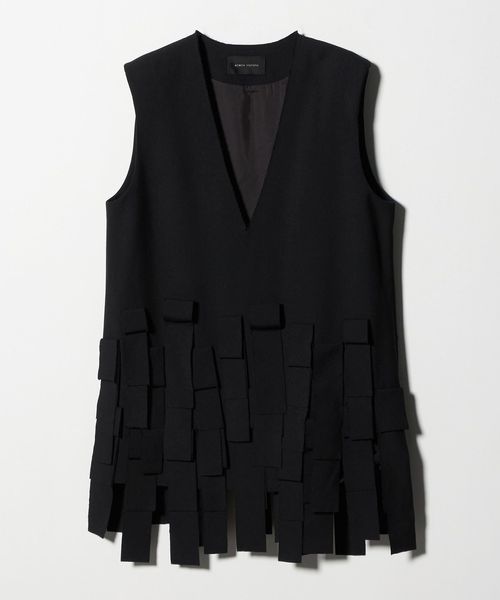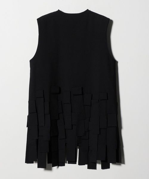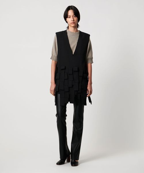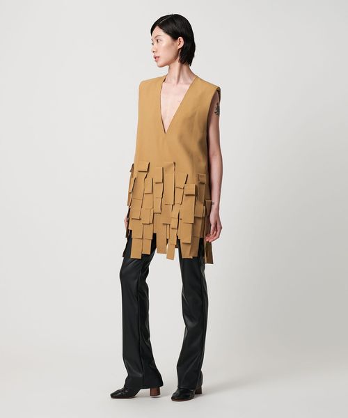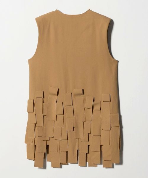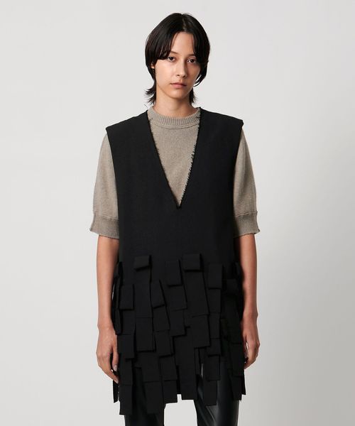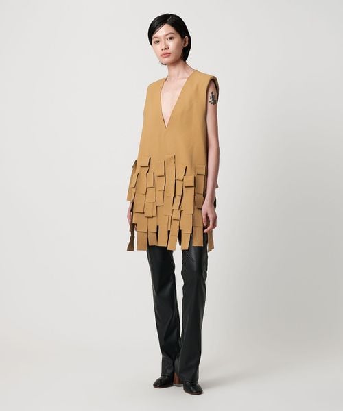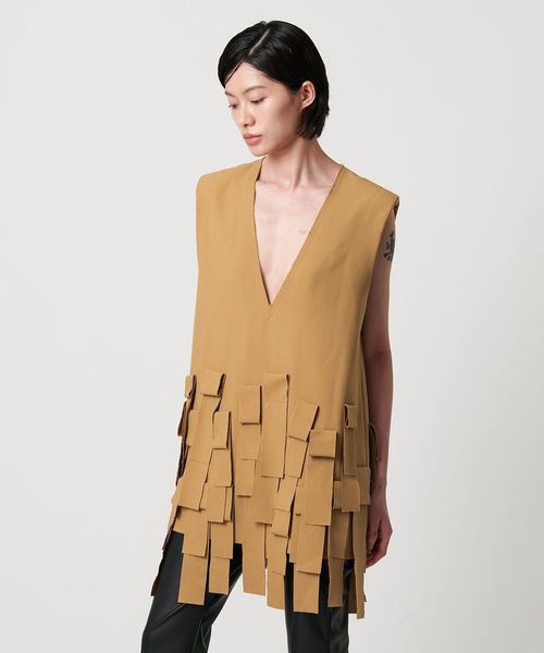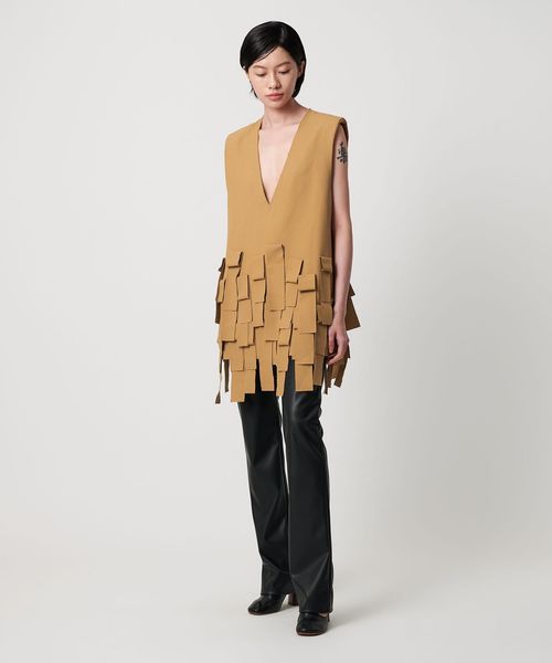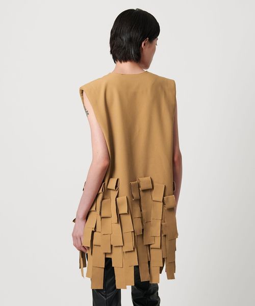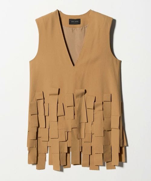 ネック周りやフリンジの周囲はカットオフにすることで、上品なシルエットにラフな印象をプラス。