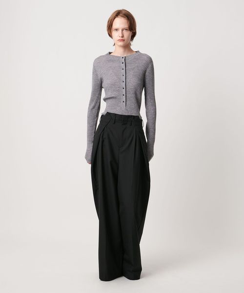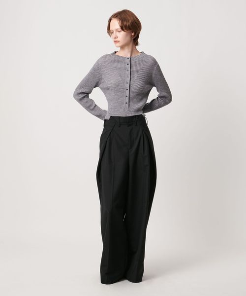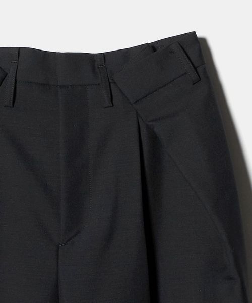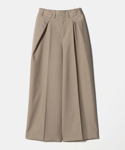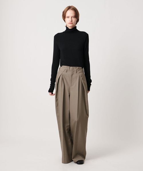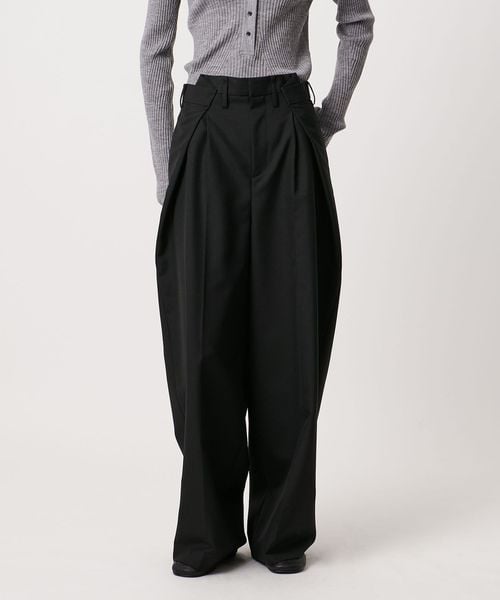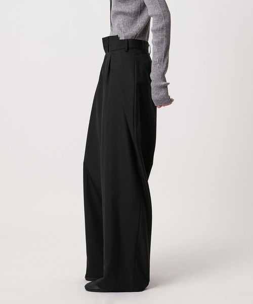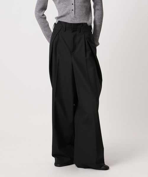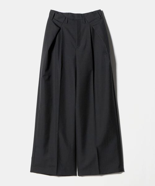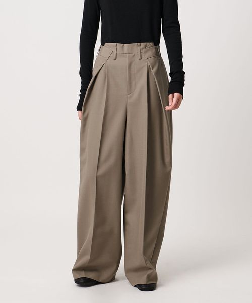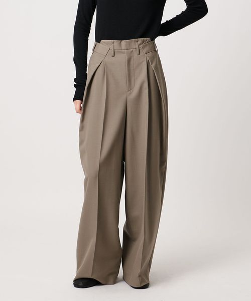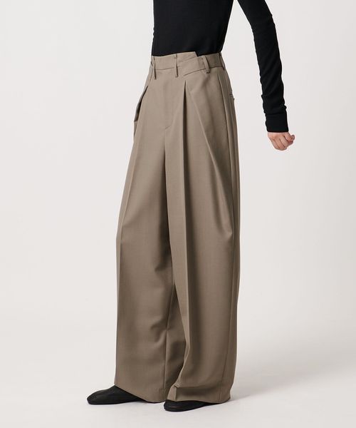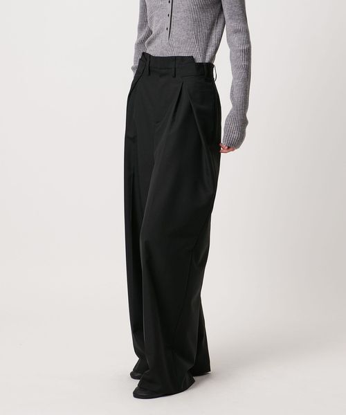 大胆なウエストイレギュラータックがポイントのワイドパンツ。