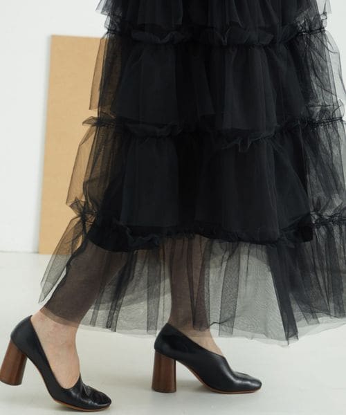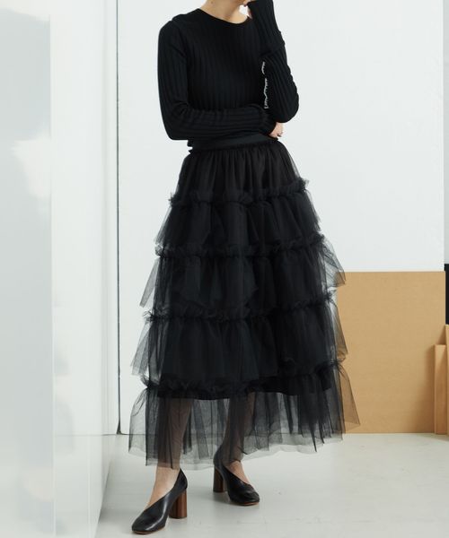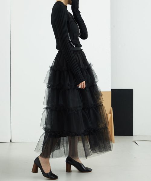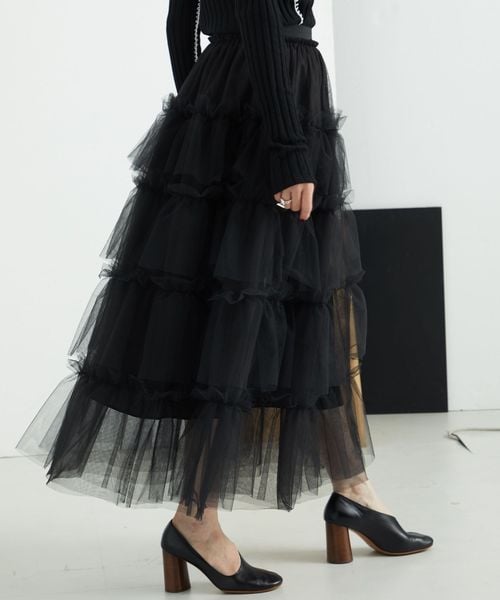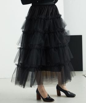 ギャザーフリルを大胆にあしらった、たっぷりのボリューム感が目をひくチュールマキシスカート。