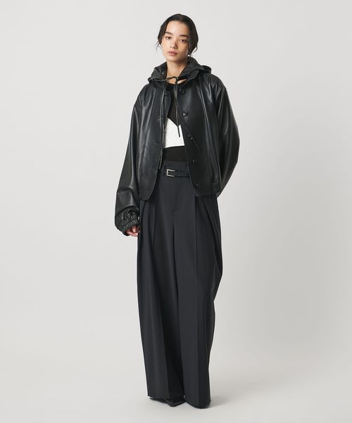 レザーのブルゾンやスカートなどの、ハードめなアイテムも女性らしく仕上げてくれます。