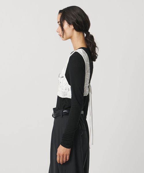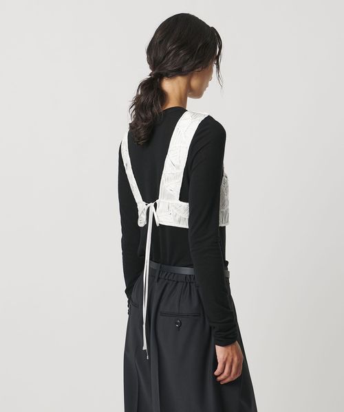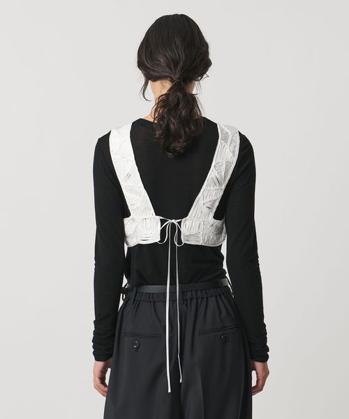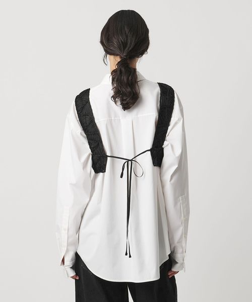後ろはリボンを結んで着用し、レイヤードアイテムに合わせてサイズの微調整も可能。