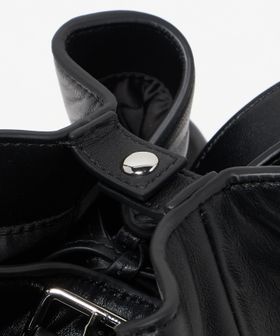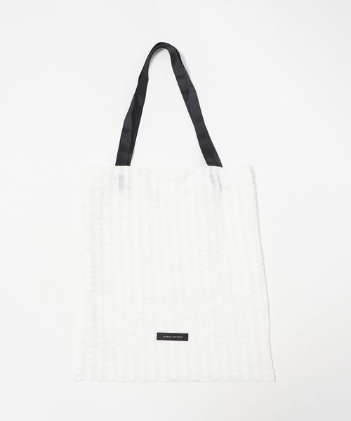 左右のタブを留めることで、折り畳んだような立体的なフォルムが生まれ、シンプルながらも印象に残るデザインです。