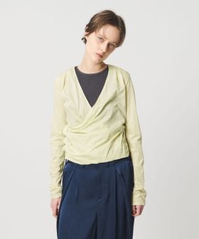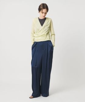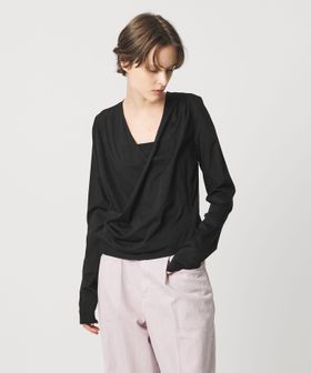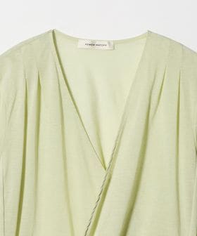 肩に入れたタックと、左身頃のイレギュラーなスナップボタンの留め方により、ニュアンス感のあるドレープを表現しています。