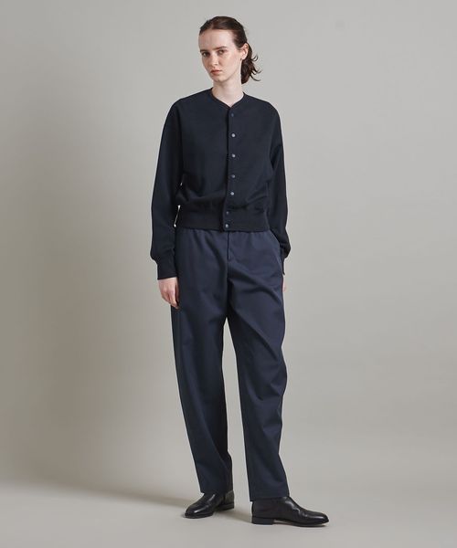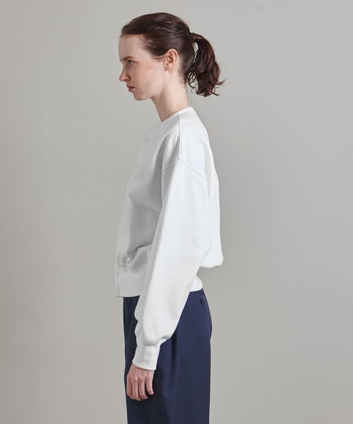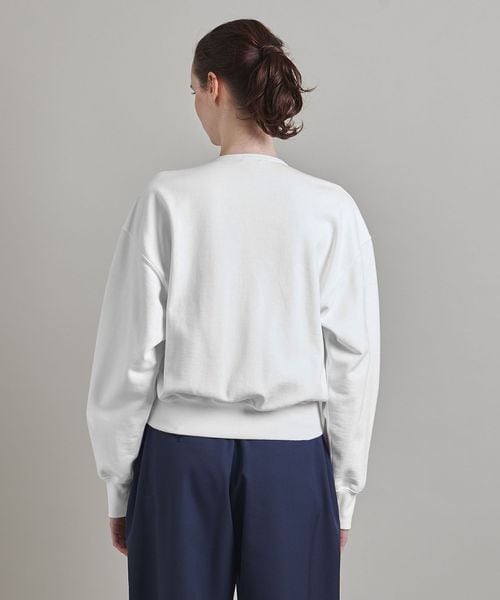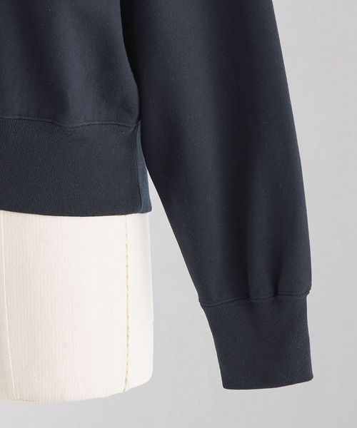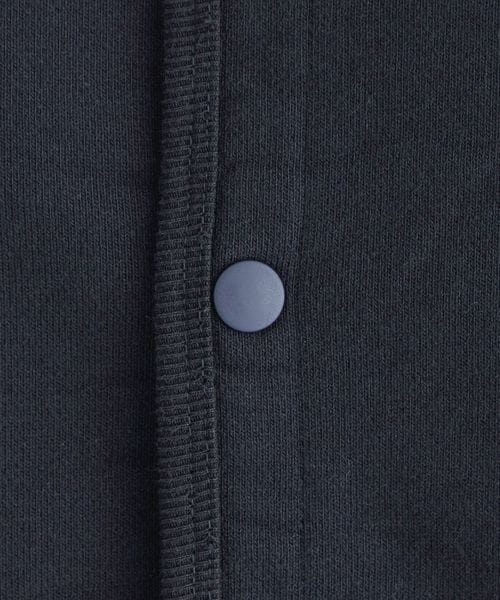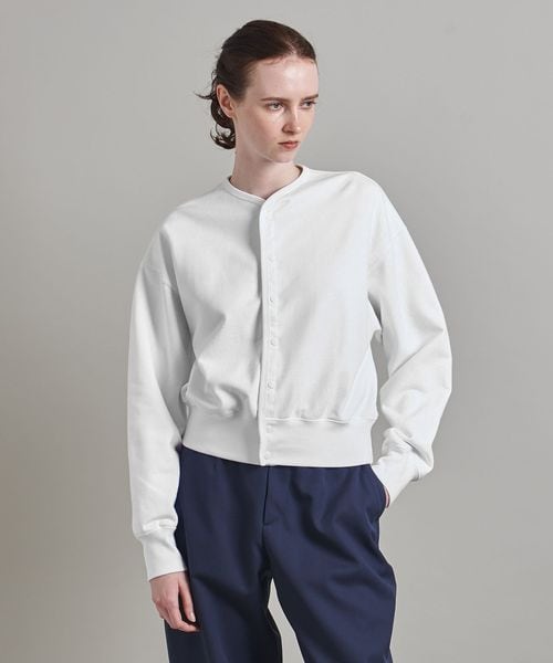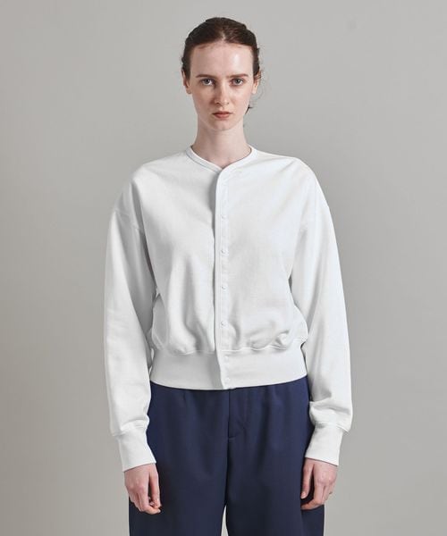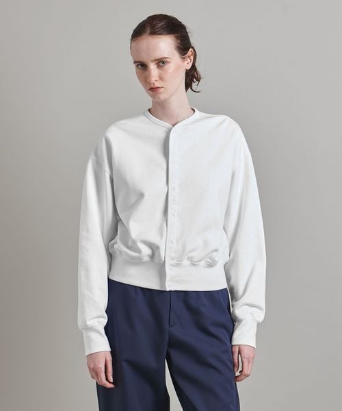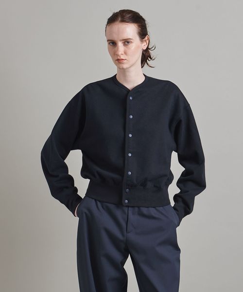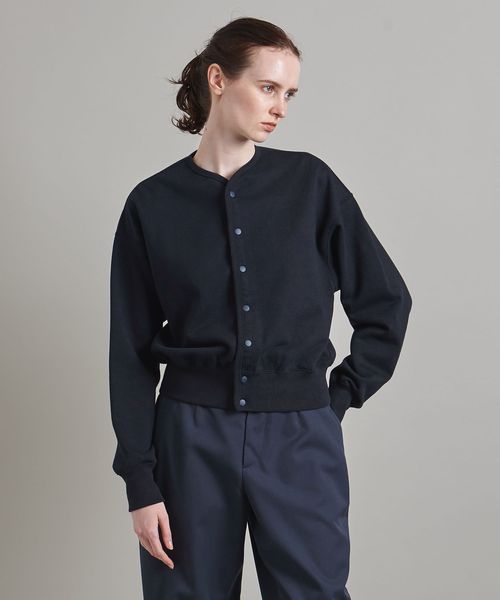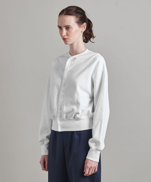 ドロップショルダーのゆとりあるスリーブデザインに対して、フィット感のある裾がメリハリを生むスウェット素材のカーディガン。