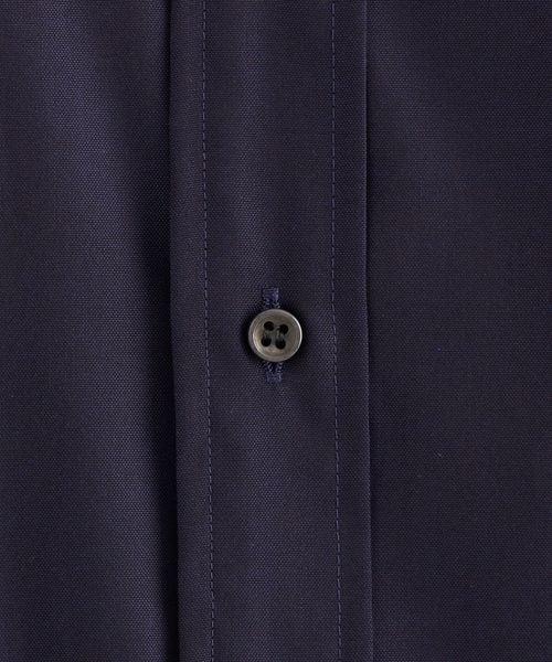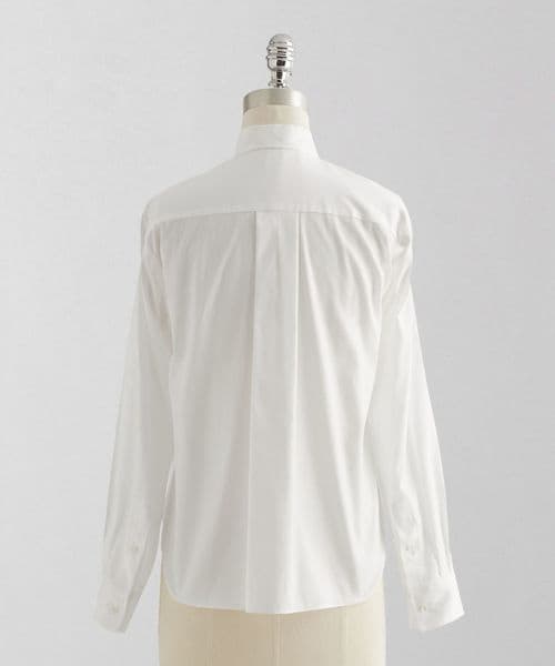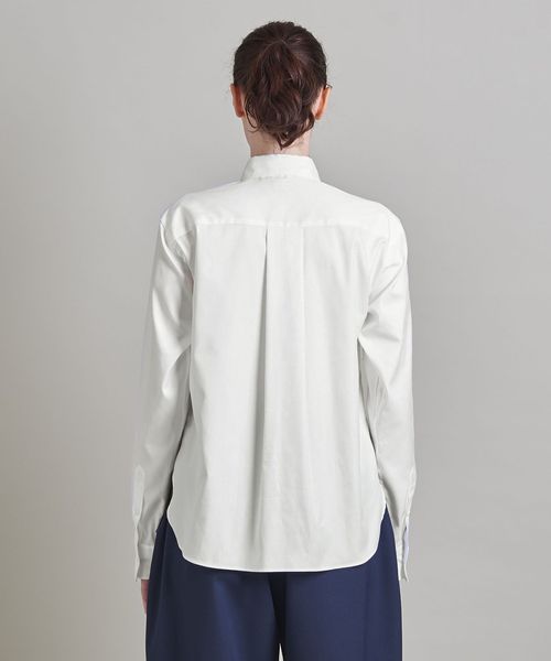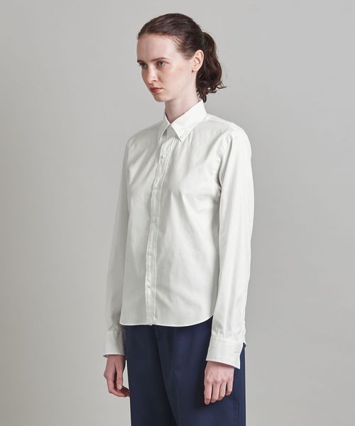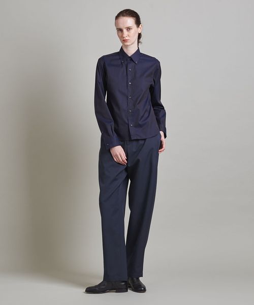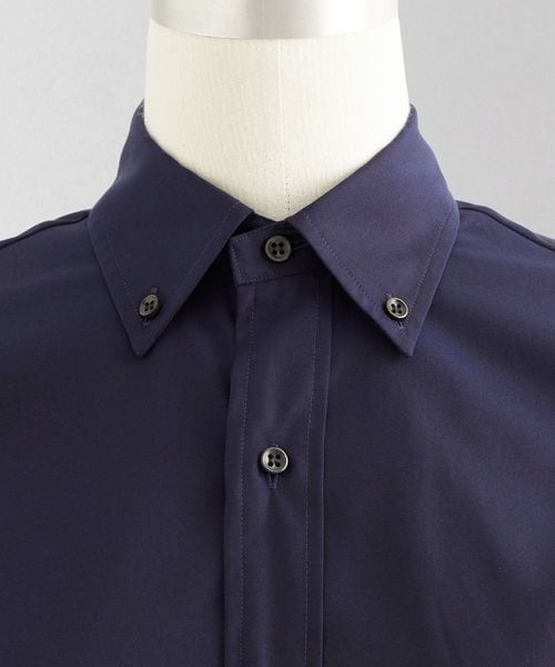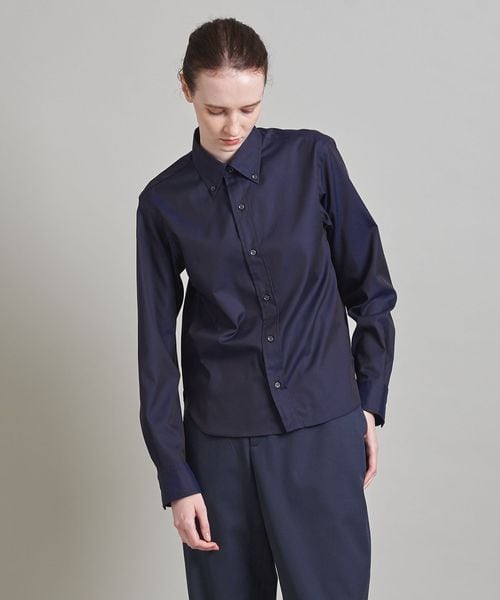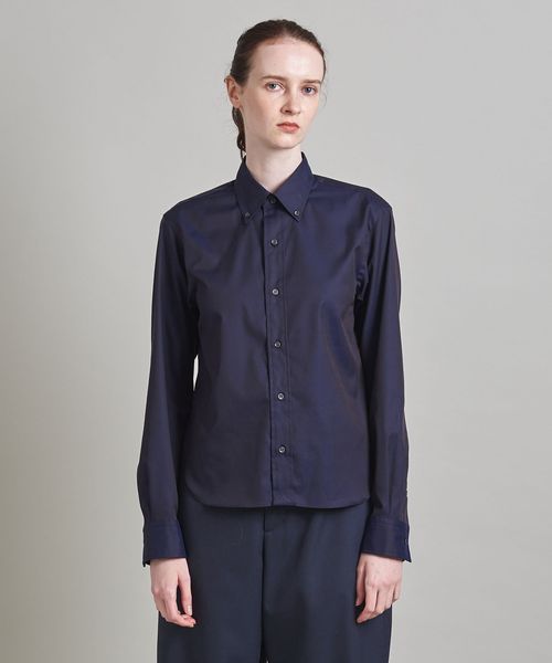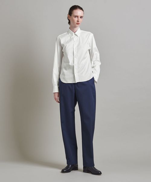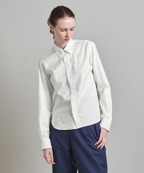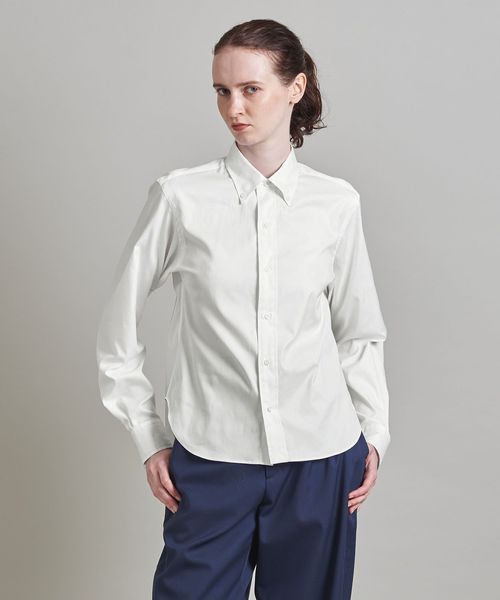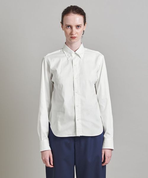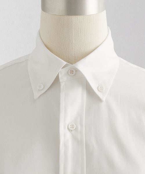シャキッとしたボタンダウンの襟に細身のボディがポイントのシャツ。