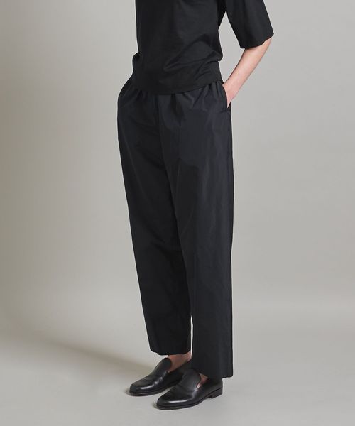 ウエストゴムでリラックス感のある気軽さもありつつ、素材の上品さでラフに見えないのがポイントのクロップドパンツ。