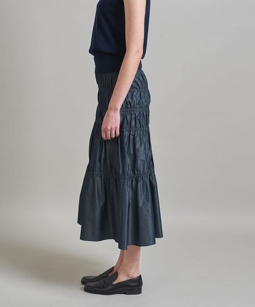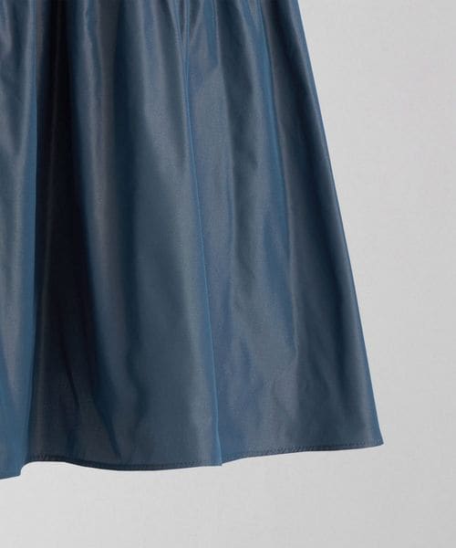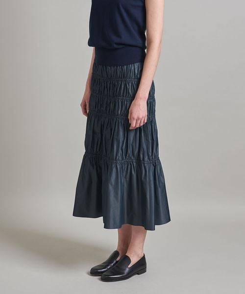 ギャザーと裾のドレープが華やかなタフタ素材のフレアスカート。