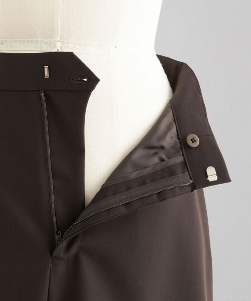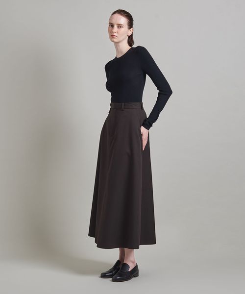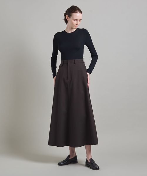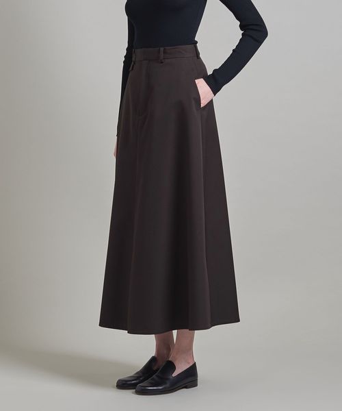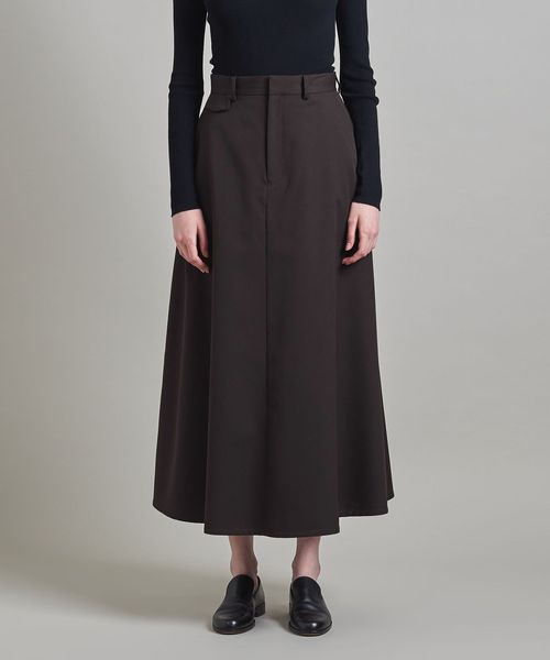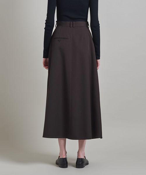 エレガントな印象の分量感のあるフレアースカートは、フラップやウエストまわりのディテールでマニッシュさをプラス。