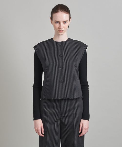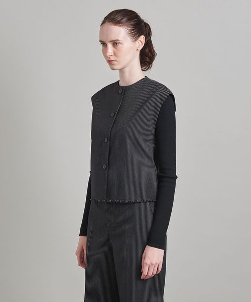 詰まり目のクルーネックに、やや肩先にかかるフレンチスリーブのミニマルでシックなベスト。