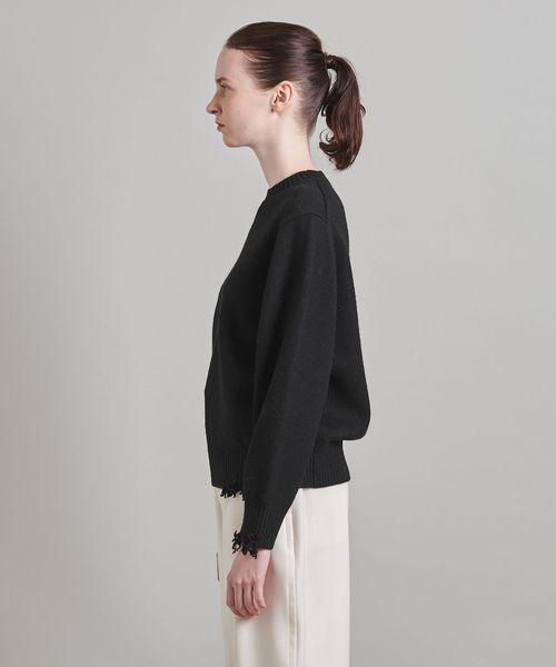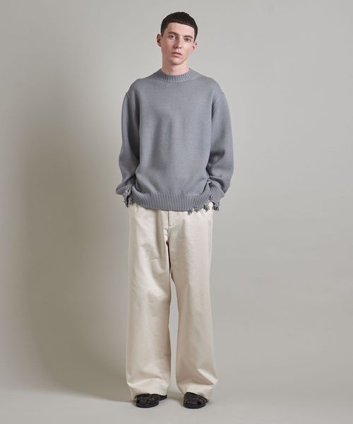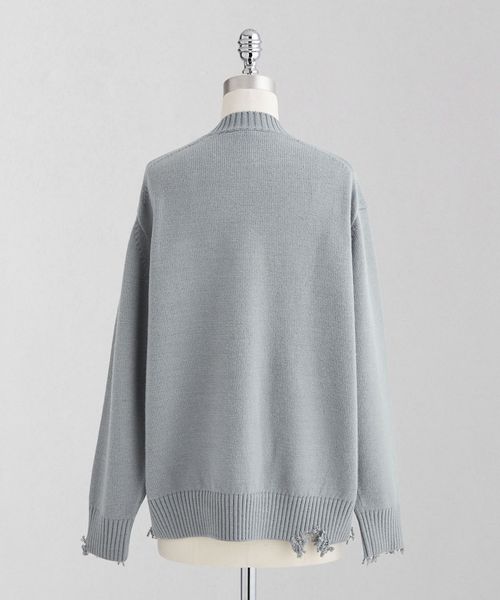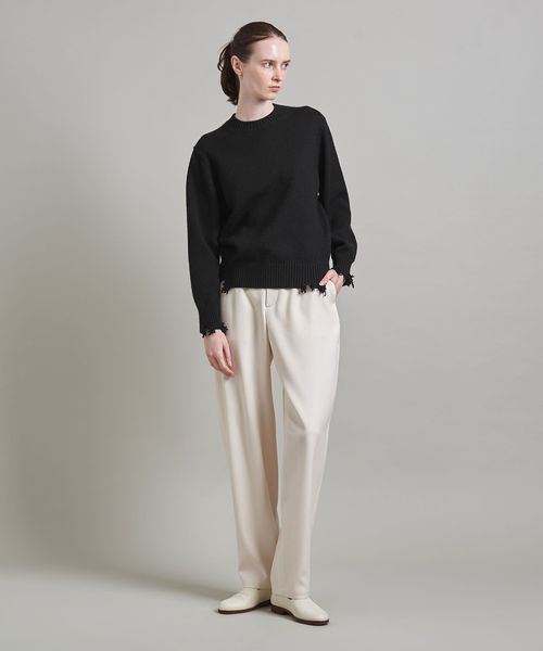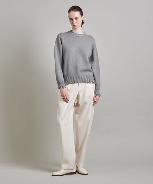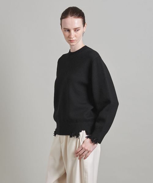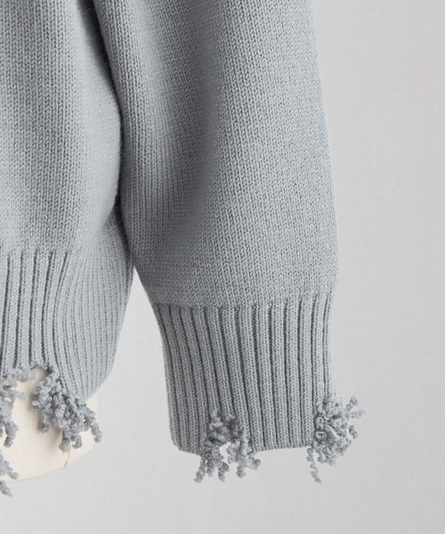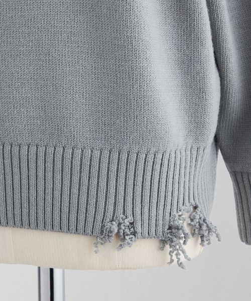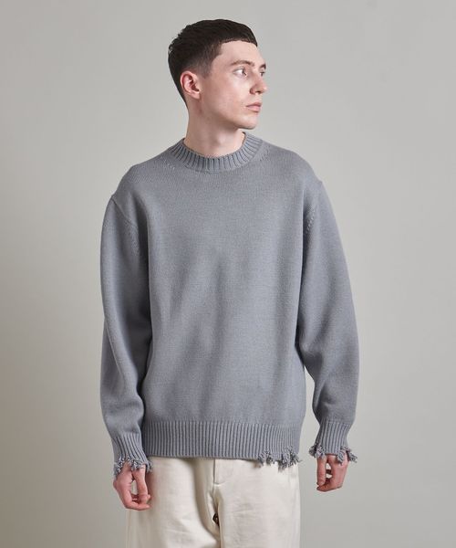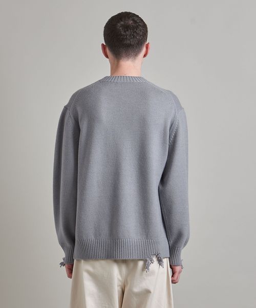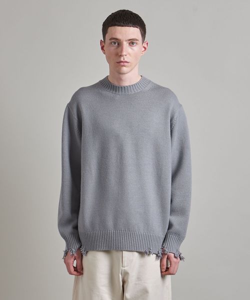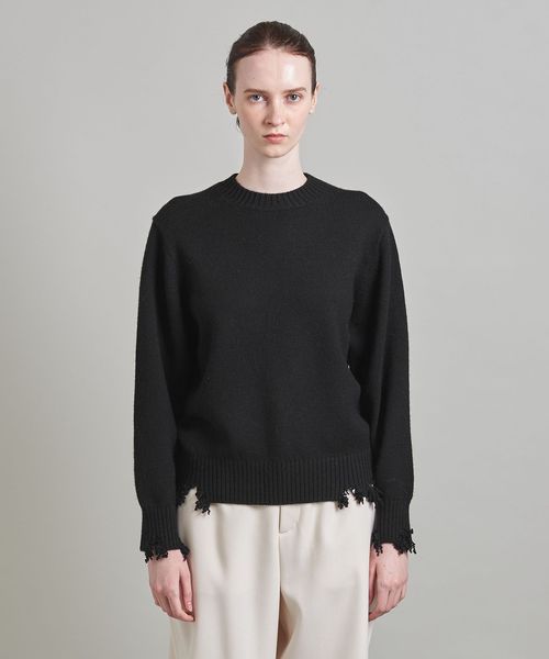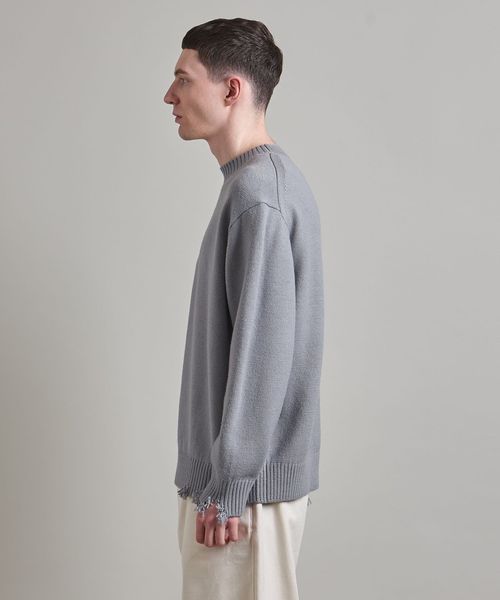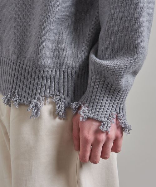 シンプルでありながらも、裾と袖口のダメージ仕様がさりげないアクセントになったニット。