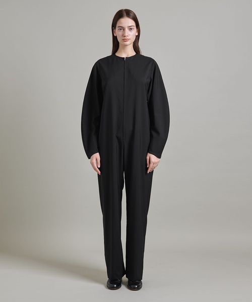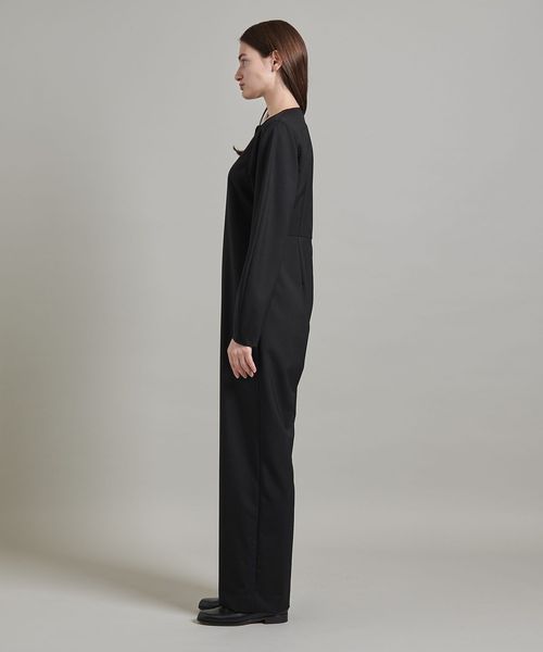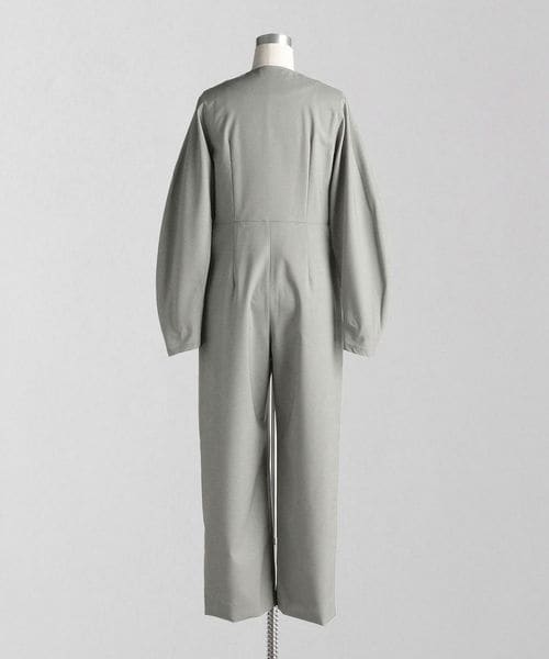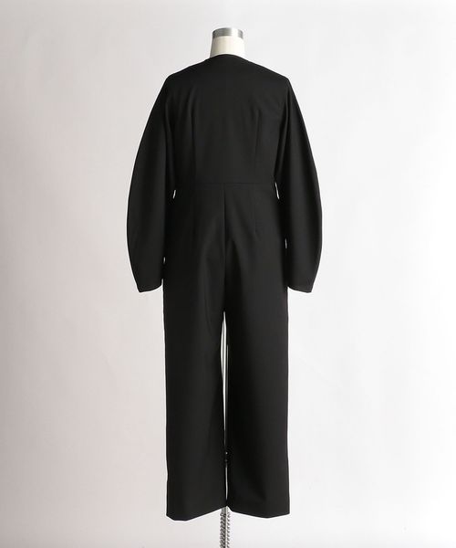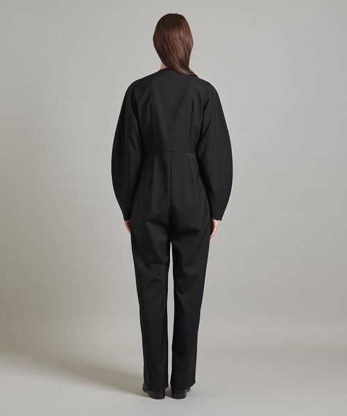後ろ身頃のダーツが生み出すウエストシェイプシルエットや、袖の丸みと流れるようなラインが特徴的なオールインワン。