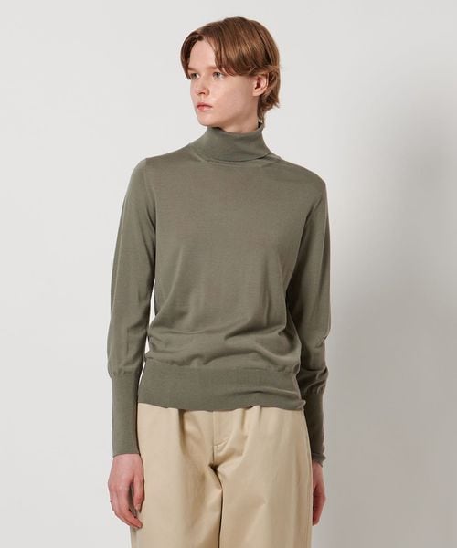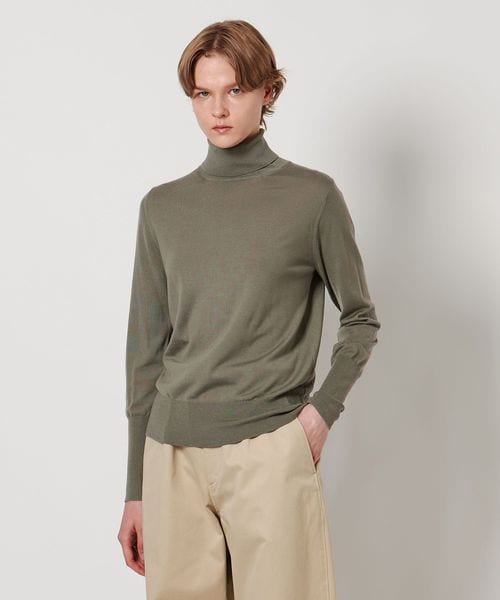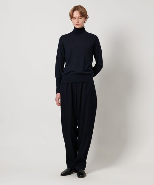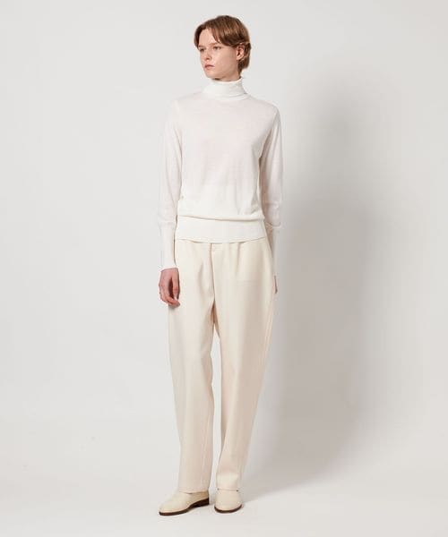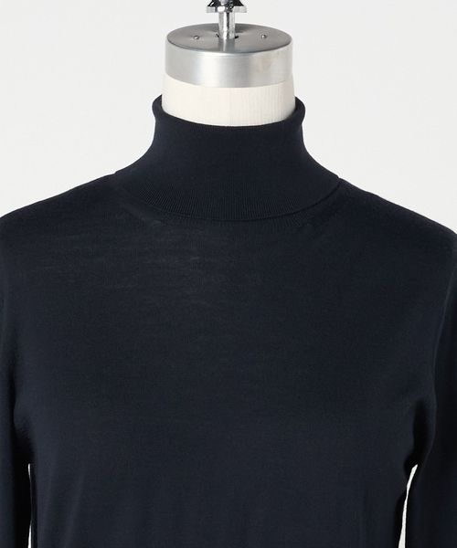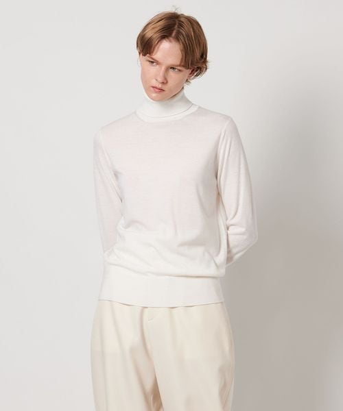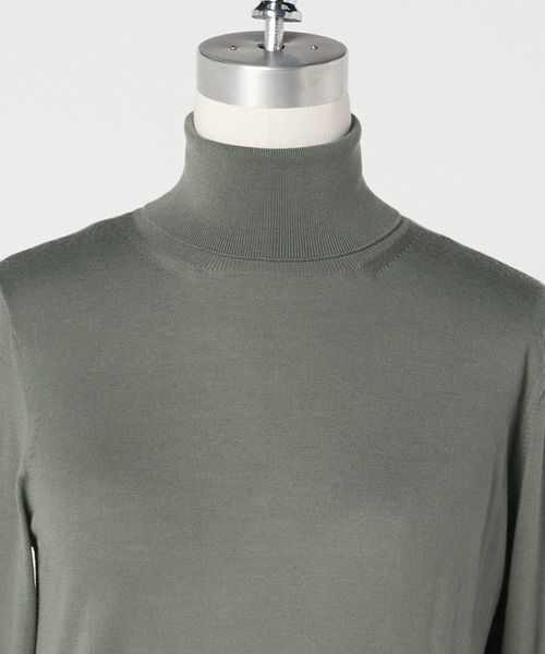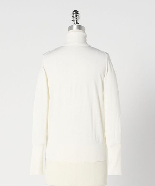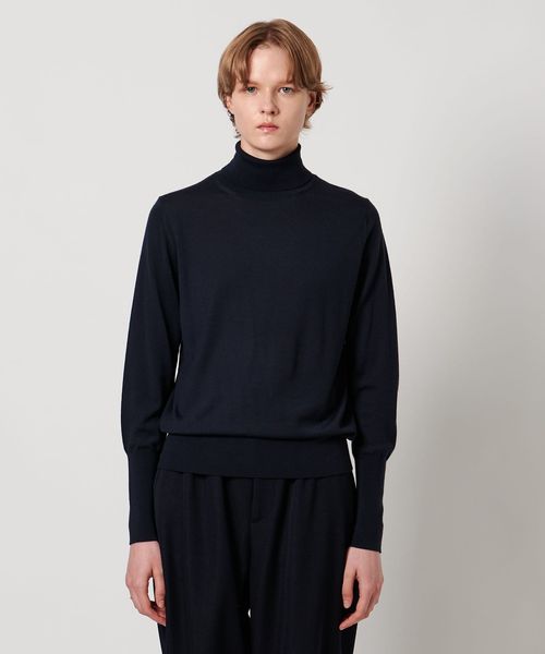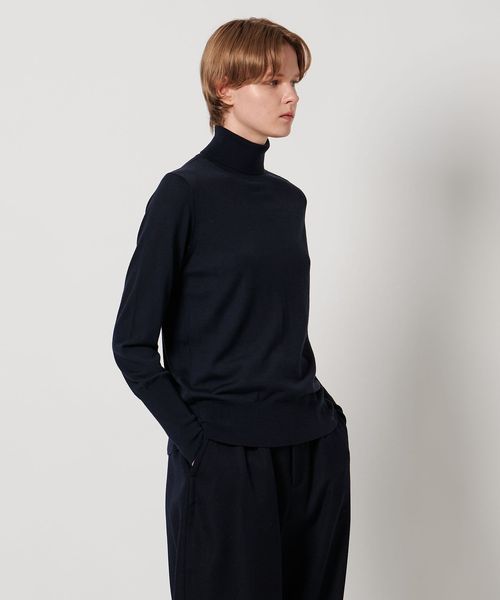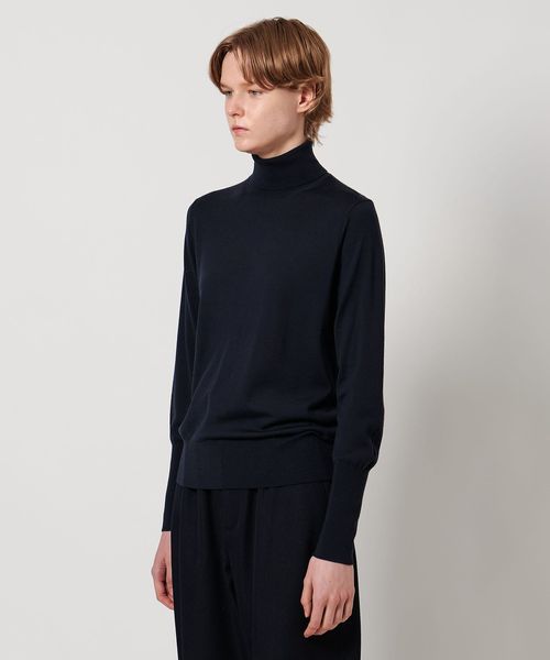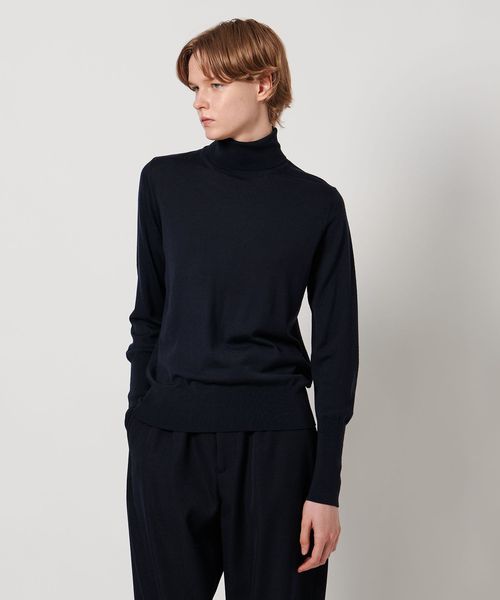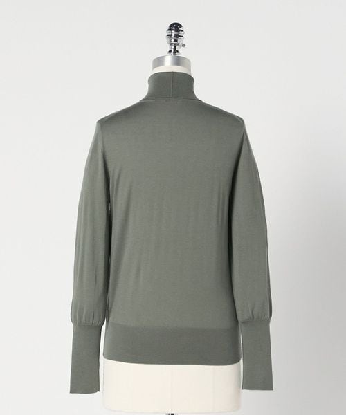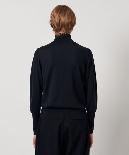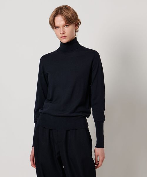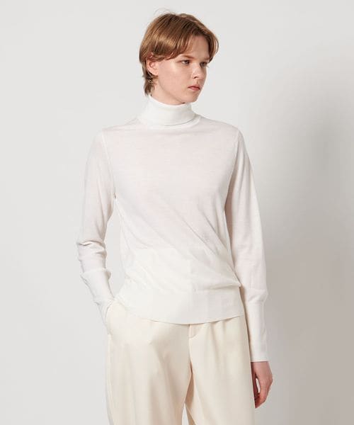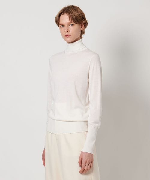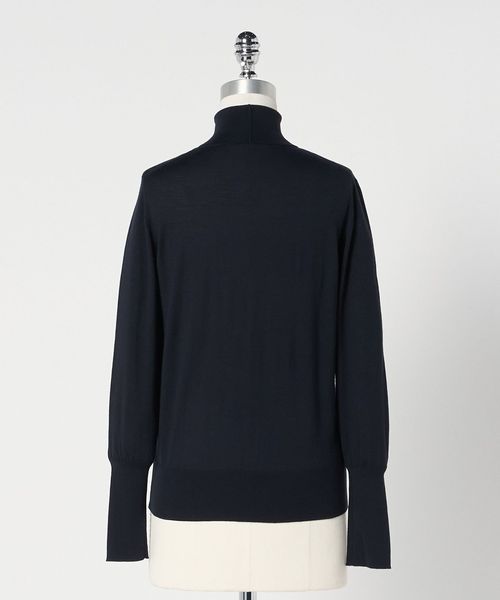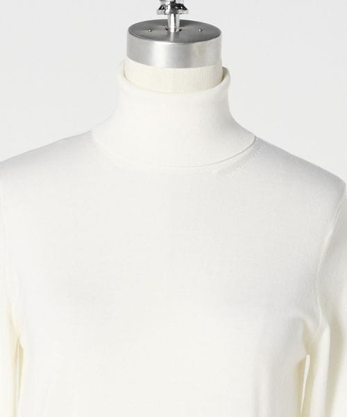 すっきりとしたネックラインが美しく収まるよう、身頃から続き編みで仕立てたハイゲージニット。