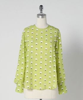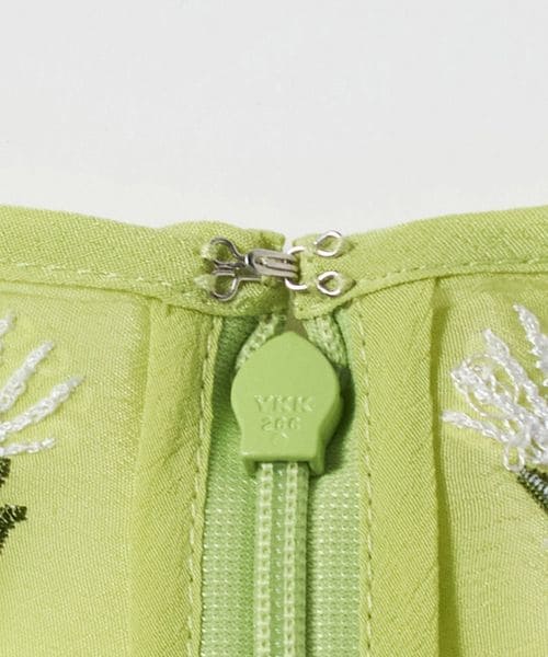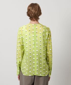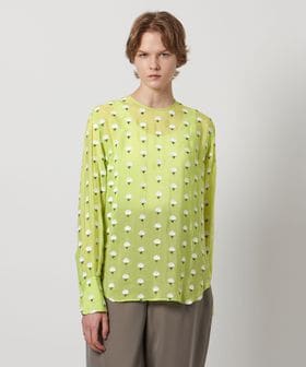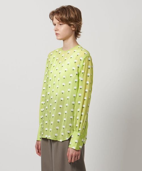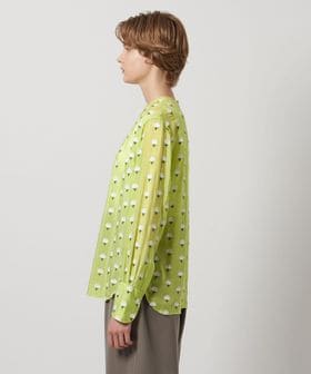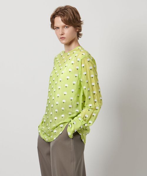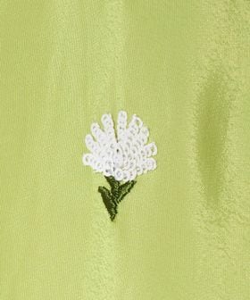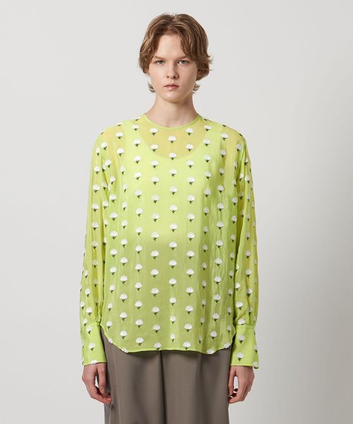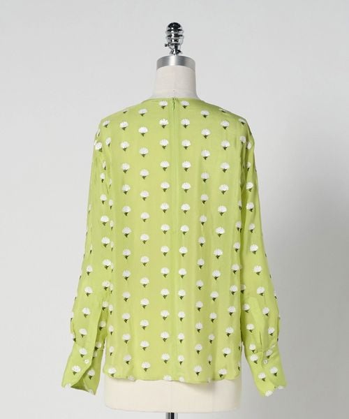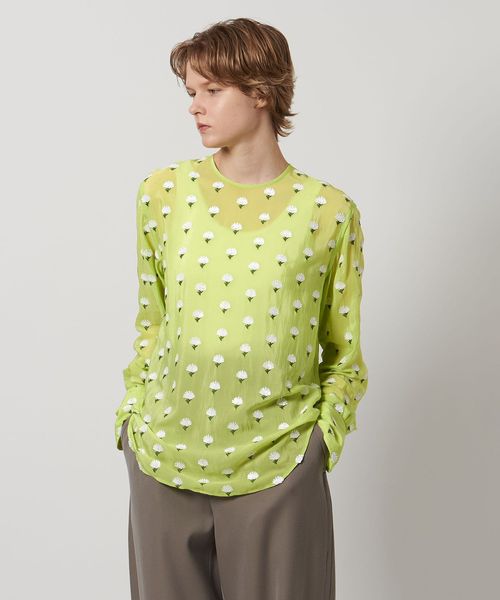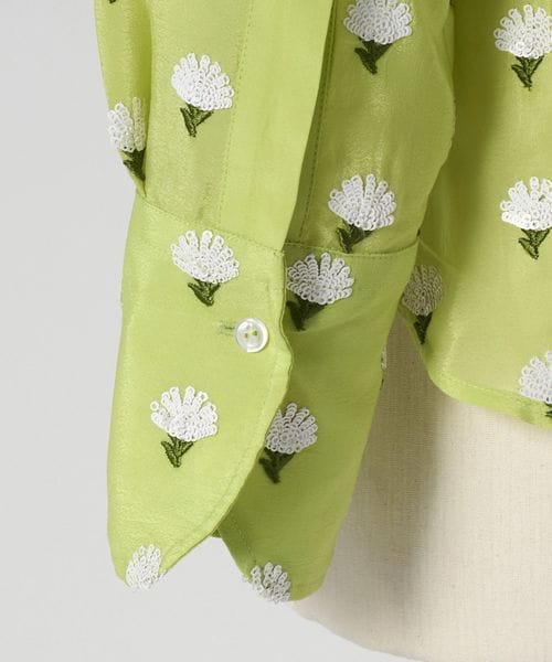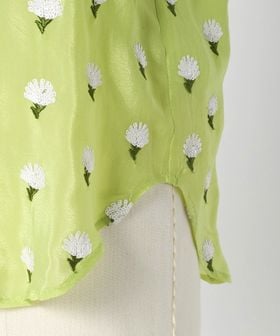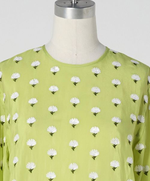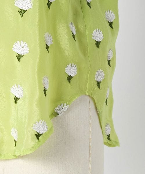 鮮やかなライムイエローのシアー素材に、ホワイトのスパンコールで植物柄の刺繍を施したプルオーバーブラウス。