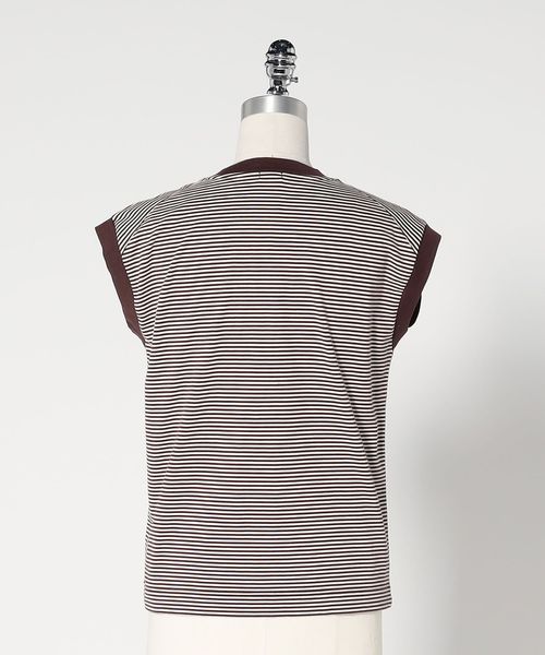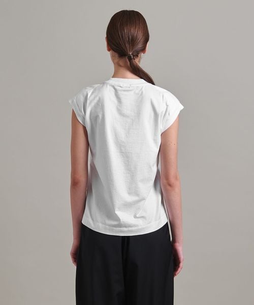 ゆったりとしたシルエットのノースリーブTシャツ。