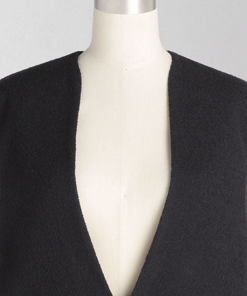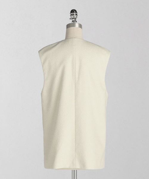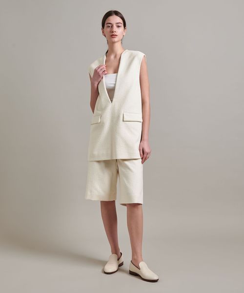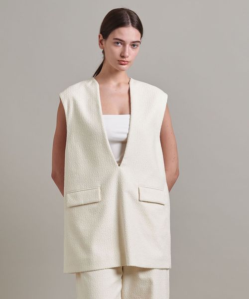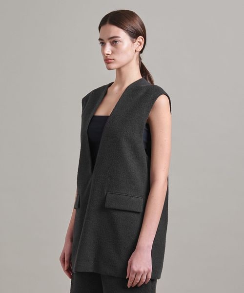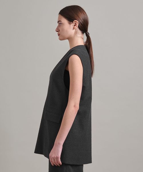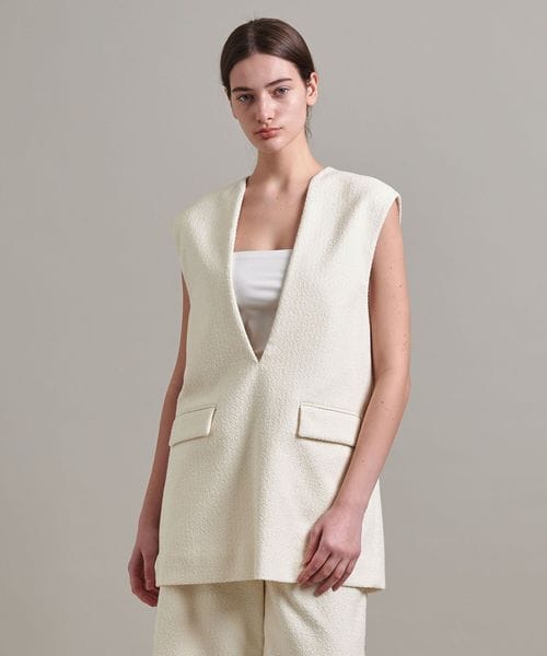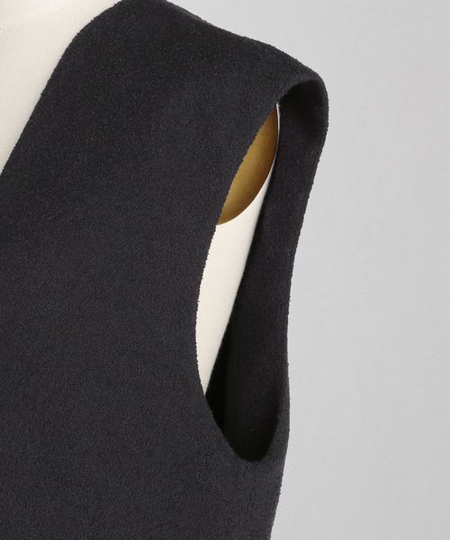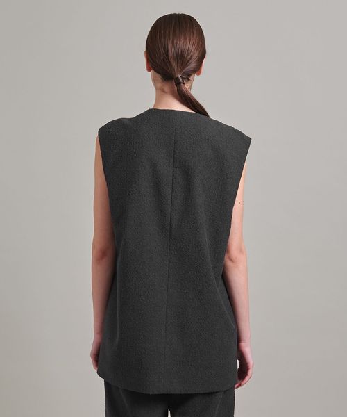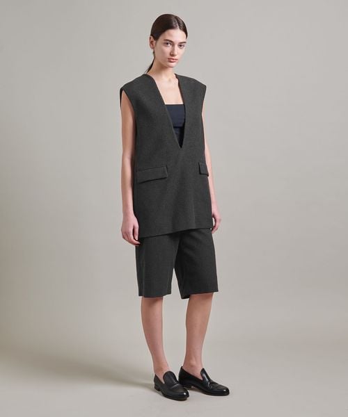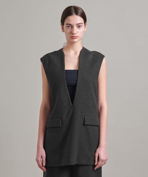 深く開いた襟ぐりのシャープなVネック開きと、ゆったりとしたボックスシルエットのボディバランスにこだわったベスト。